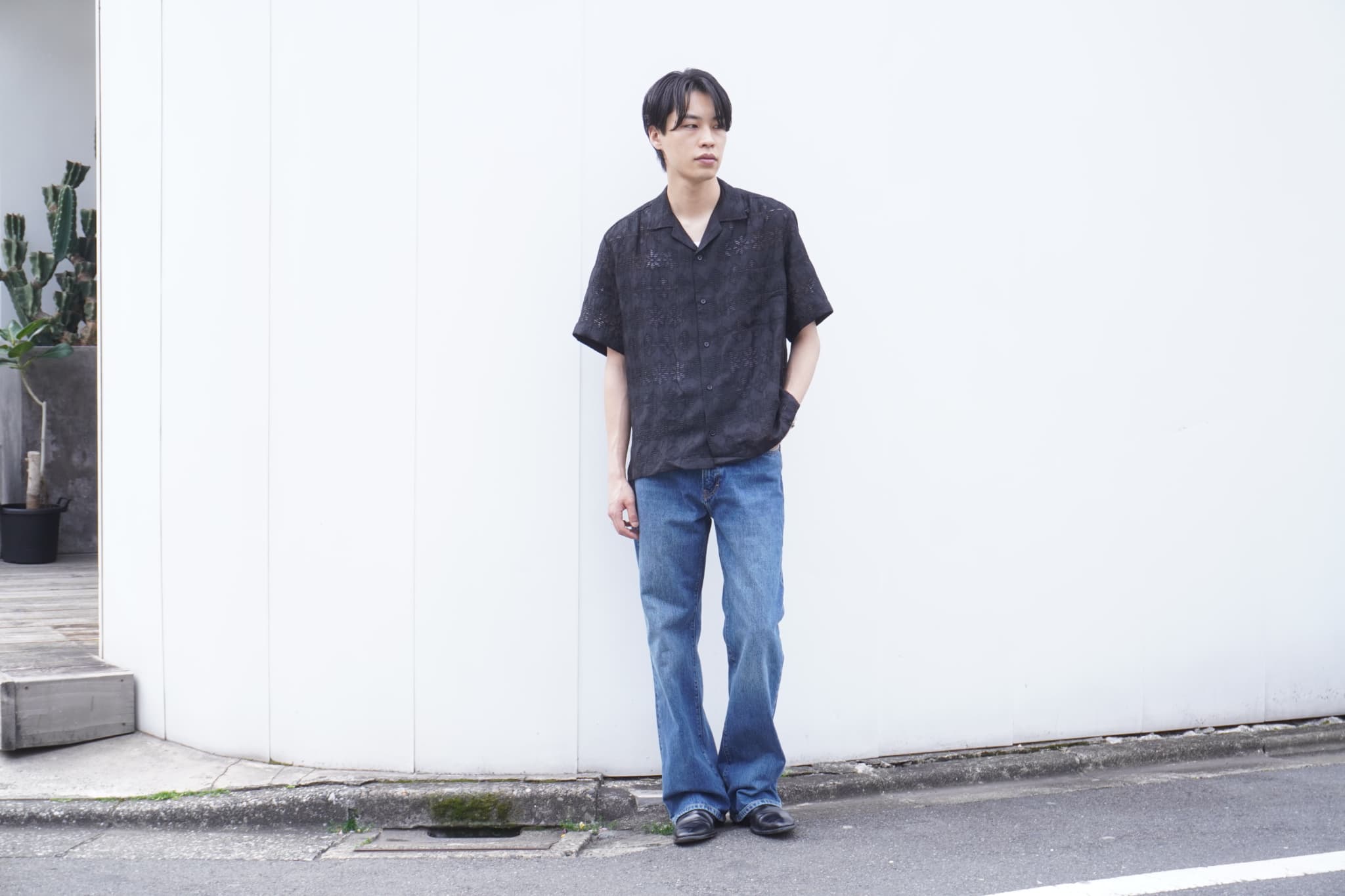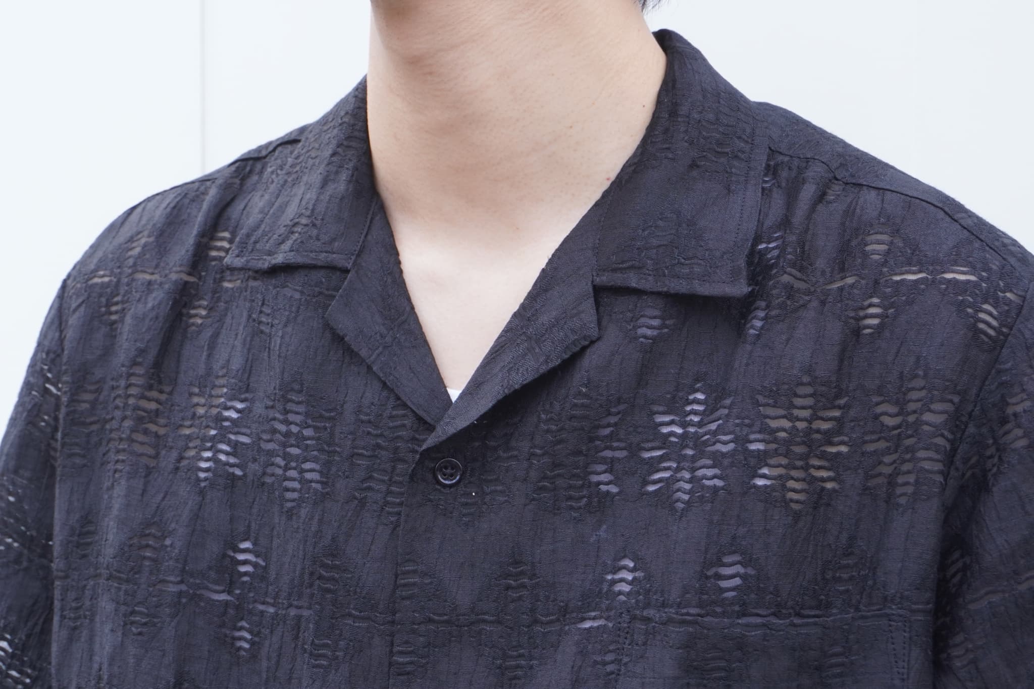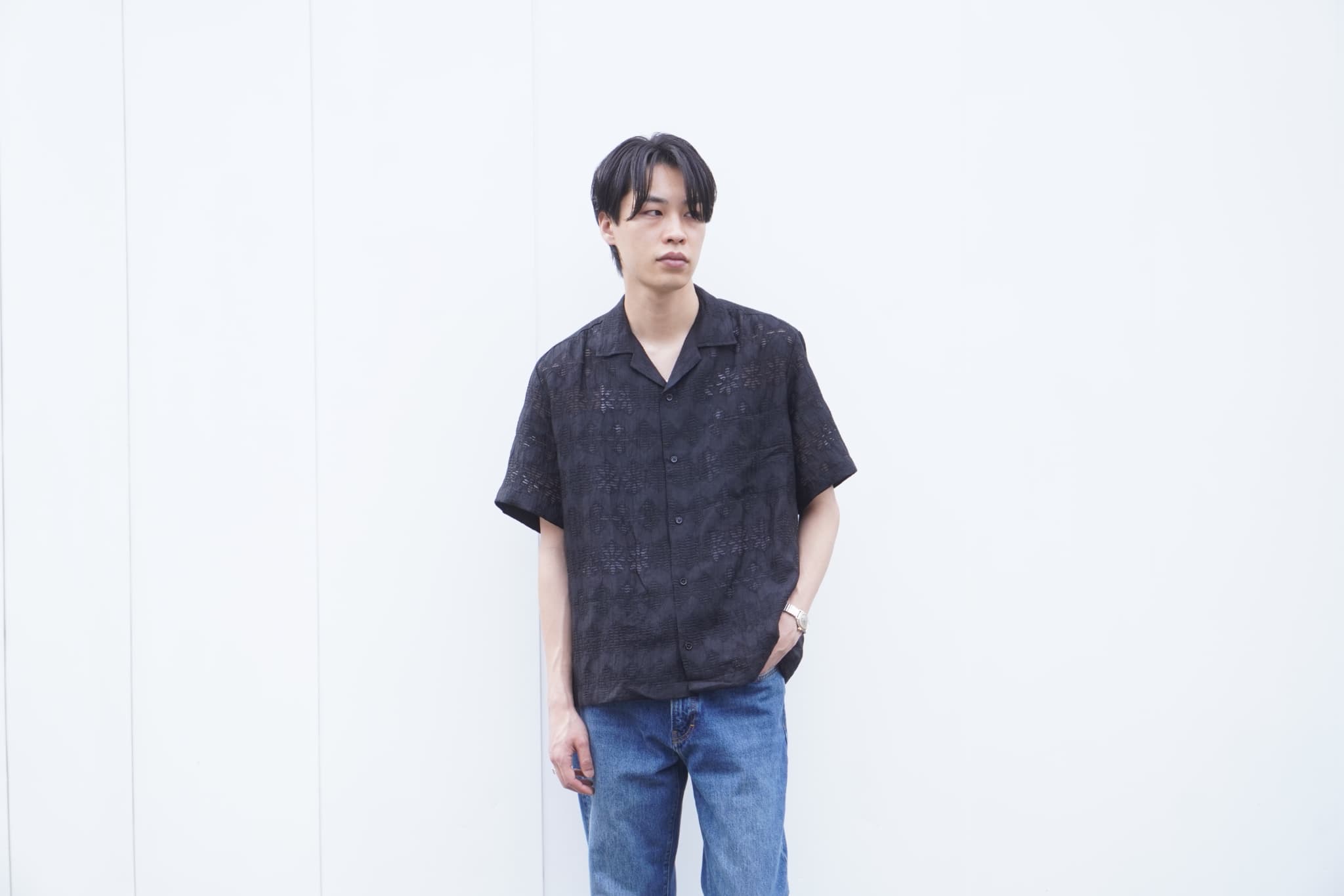 ブラックのシャツってどうしても重たい雰囲気になりがちなんですけど、素材がシアーで軽やかなので、その辺が心配ないのは汎用性が広がって嬉しいですよね。