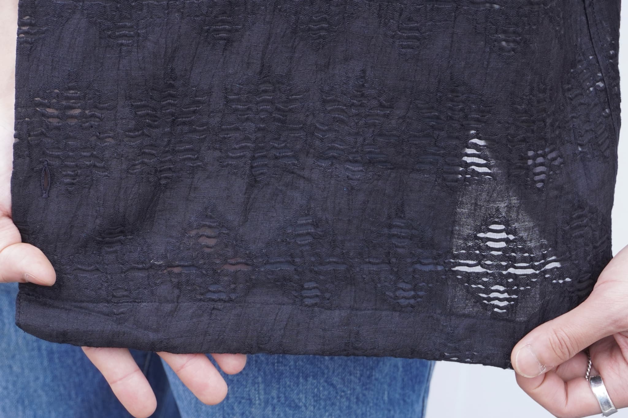 生地に透け感があるので、Tシャツの上から羽織として使って下の色を覗かせてあげるのも良さそうです。