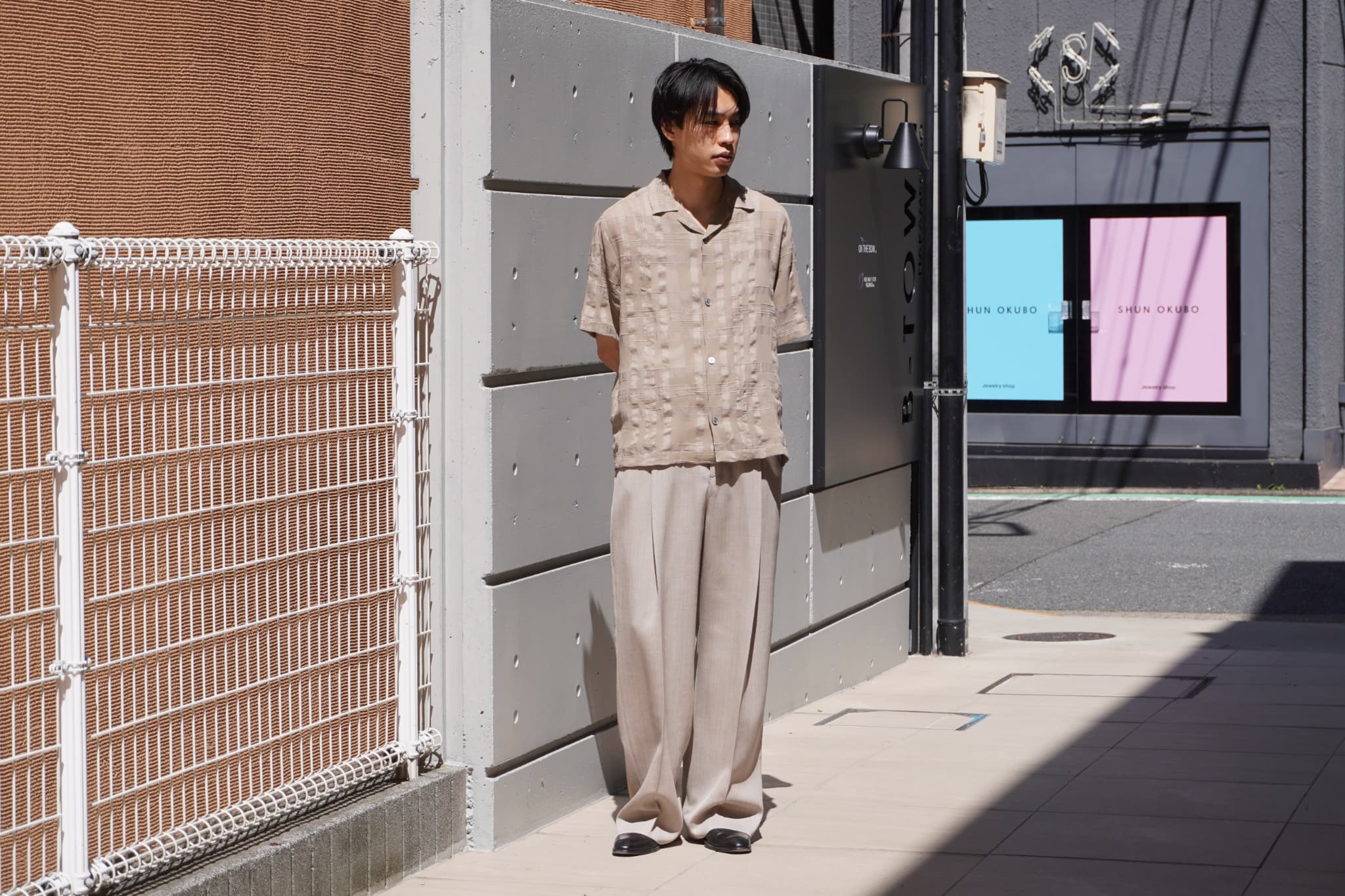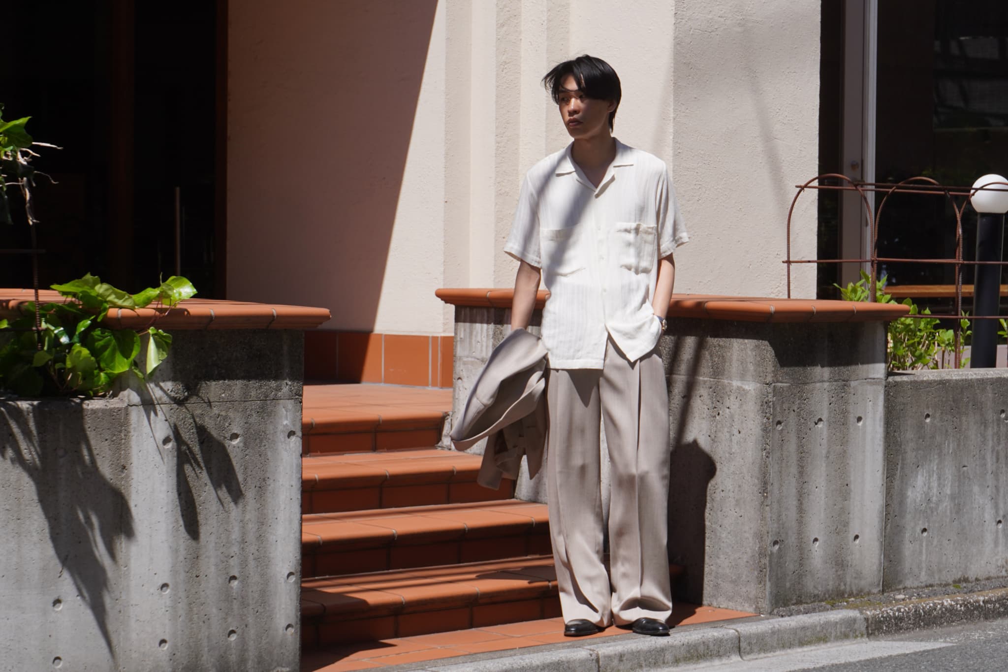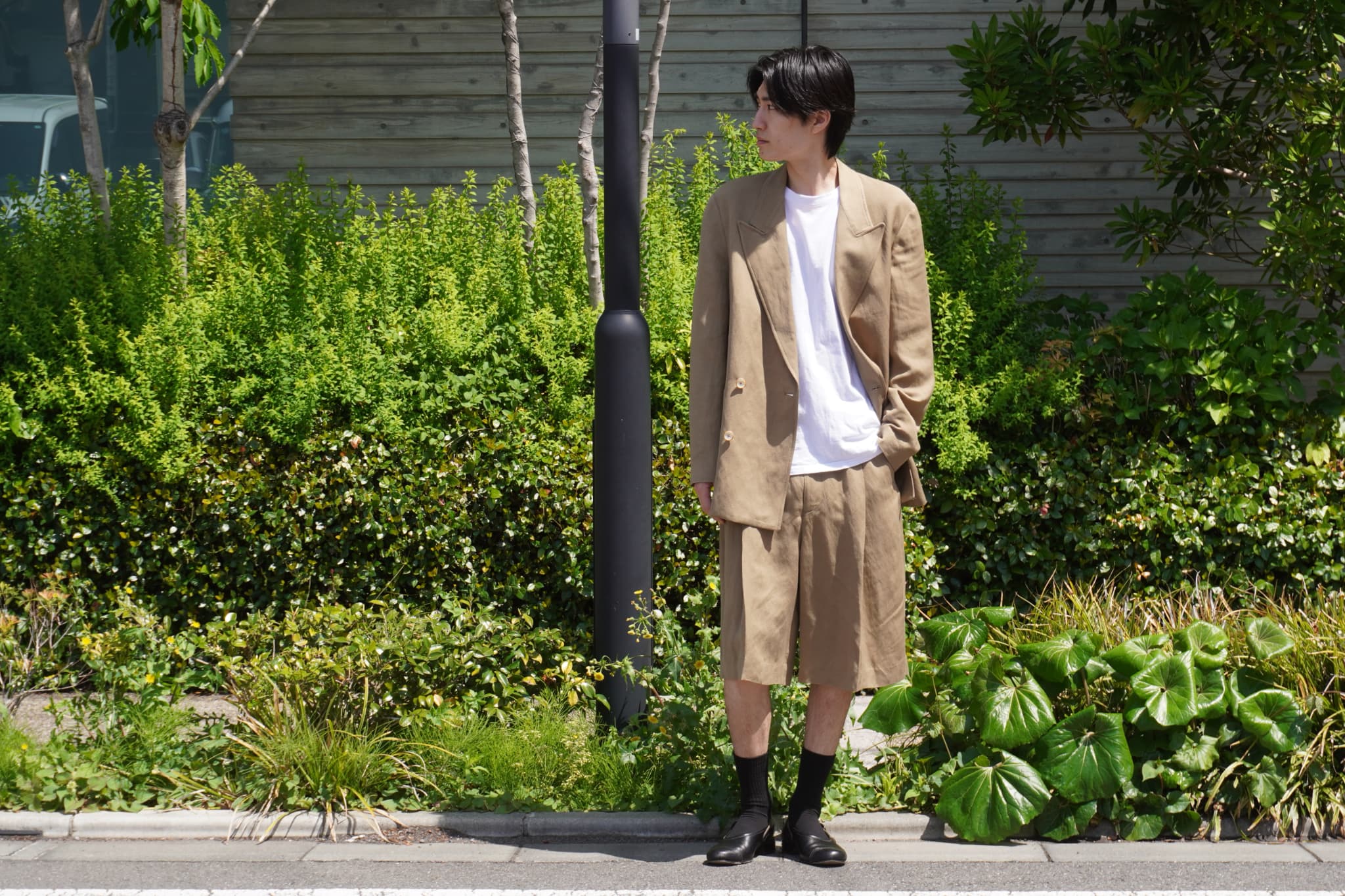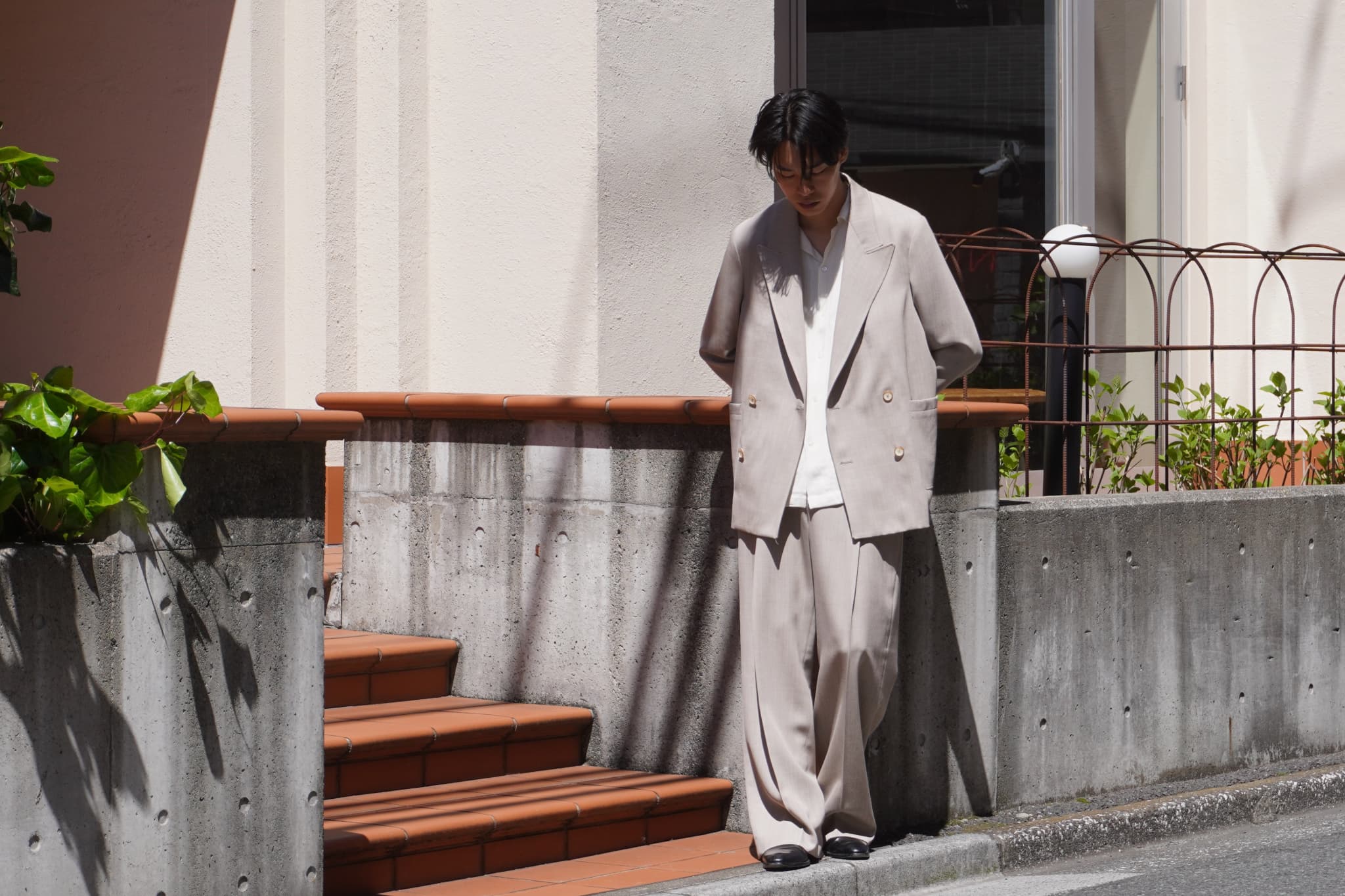 スタッフ米谷はセットアップに革靴でシンプルかつ綺麗に纏めたスタイリング。