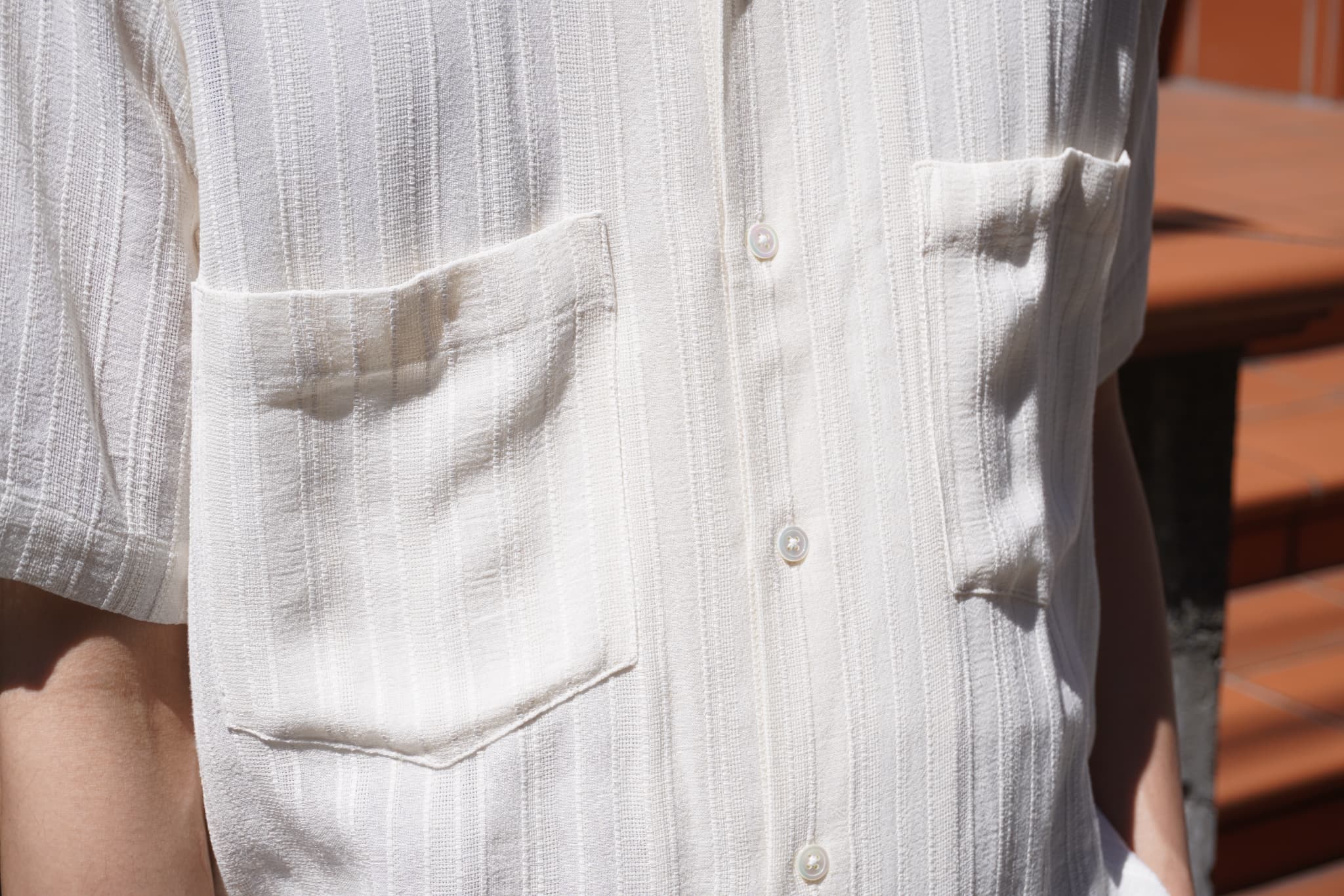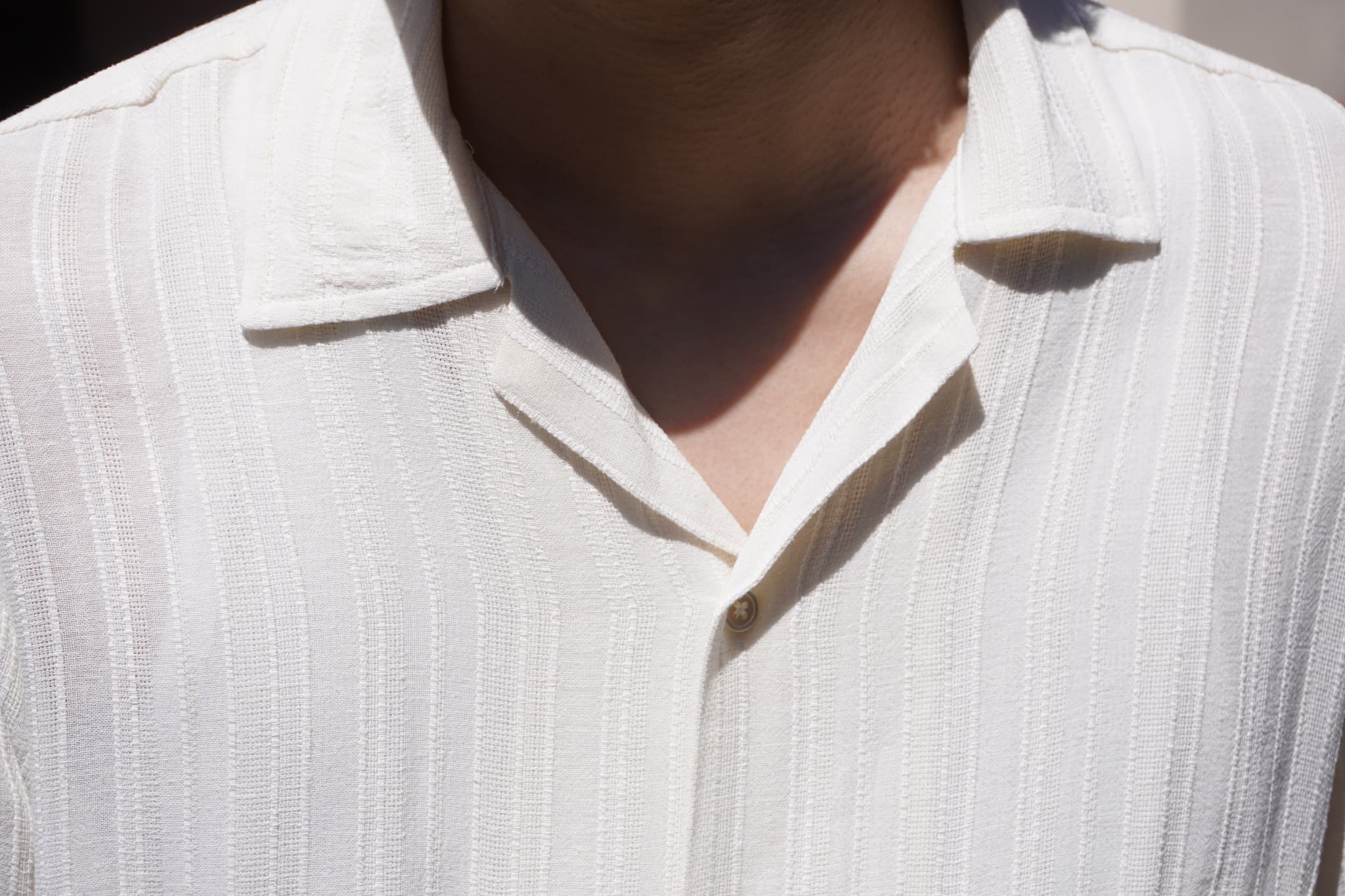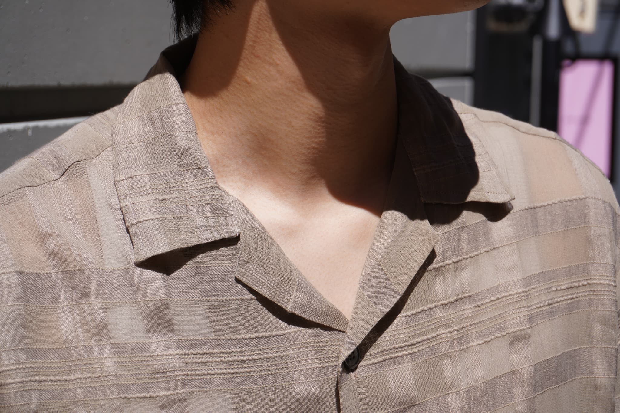 襟はリラックスしたキャンプカラーで、首元がすっきり見えるため春夏には欠かせないアイテムかと。