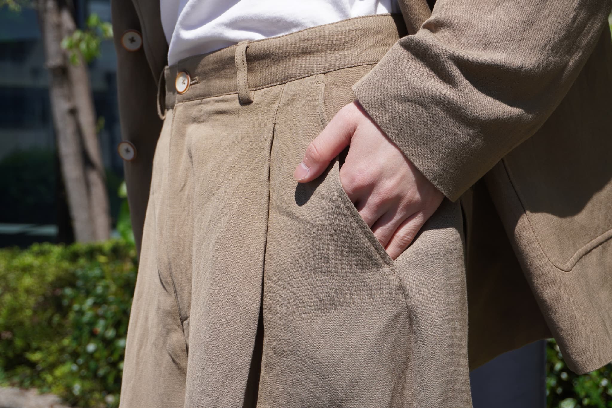 インラインより軽めの生地を使用することで、より生地に動きが生まれ、ワイドシルエットでありながらもスラックスのような上品な仕上がりに。