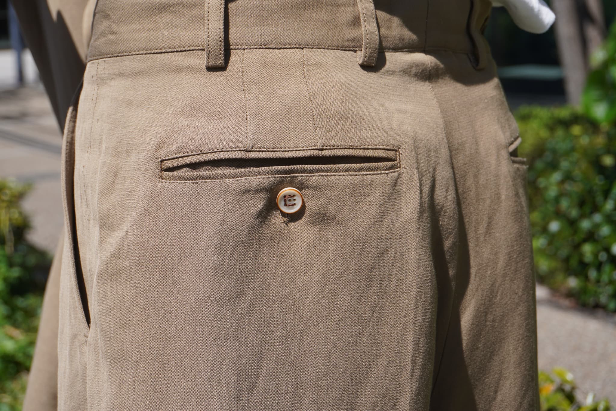 ベルトの太さも太すぎず、バックポケットはシングルウェルト仕様で、シンプルながら上品なデザインです。