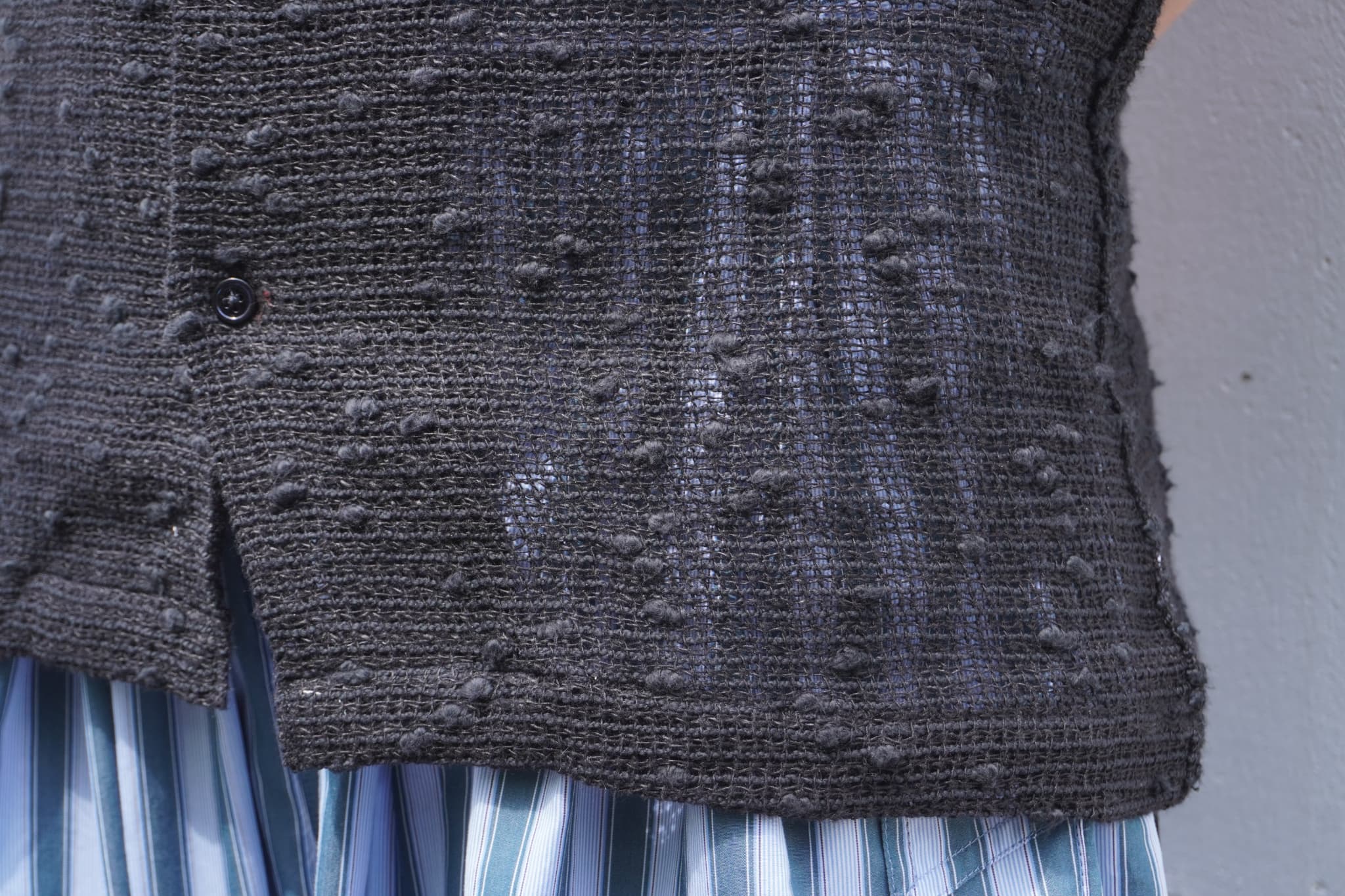 こういったレースのような素材はレディースのクチュールなんかで多用される訳なんですが、うまくメンズに落とし込んでくれていて、やはり着てみるとすんなり馴染んでくれます。
