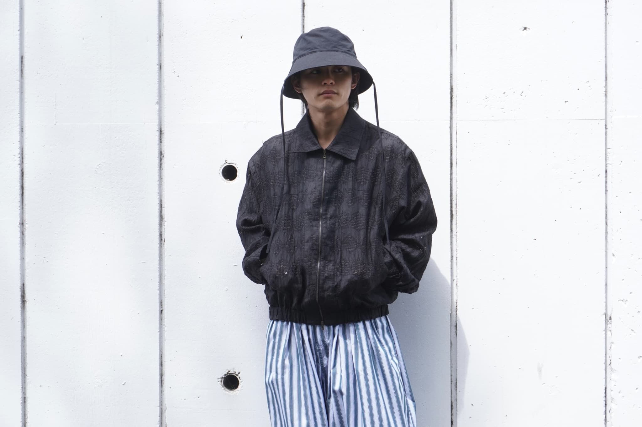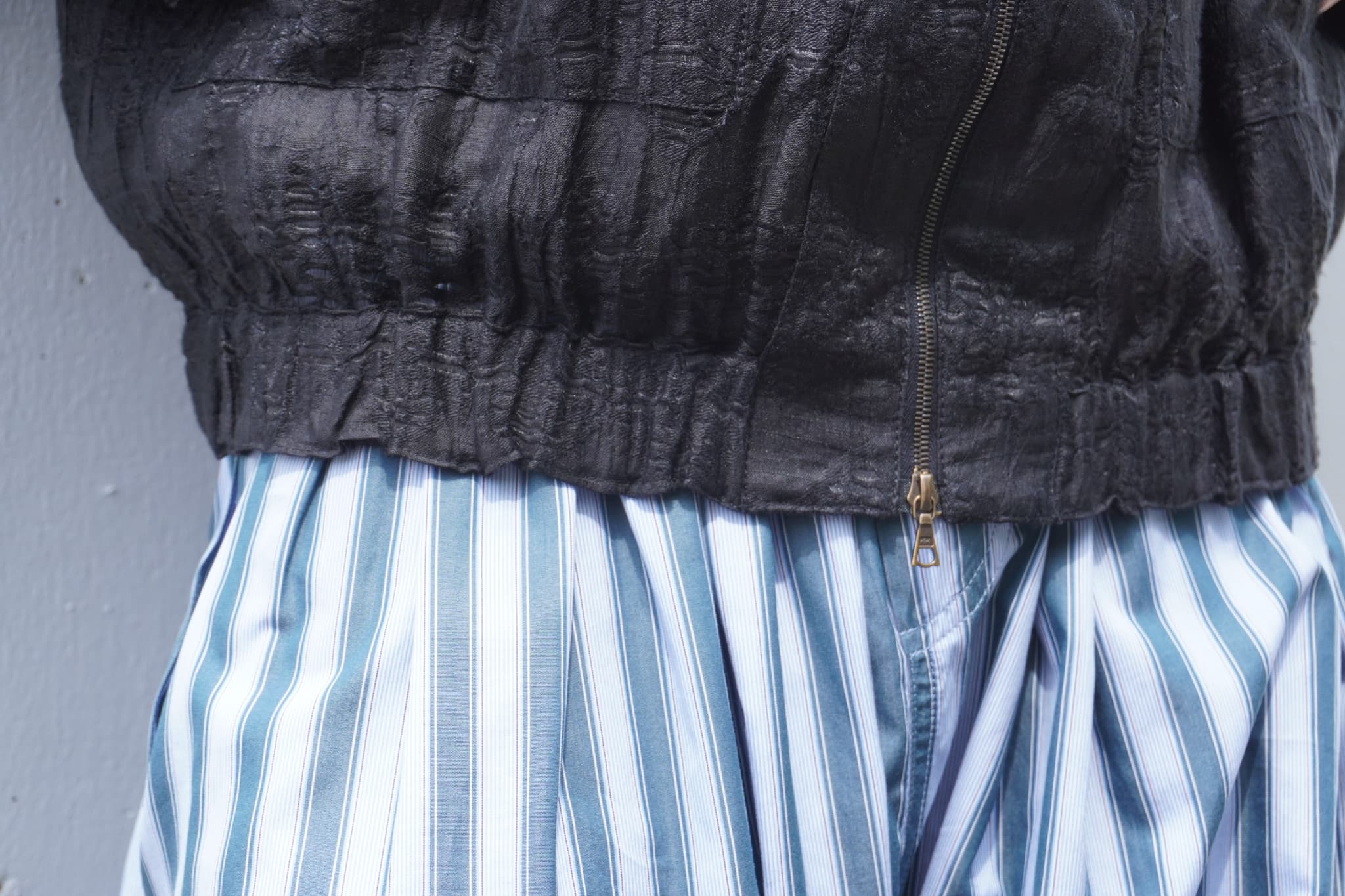 昨今勢いの衰えないショート丈に、身幅とアームホールはゆとりを持たせ、袖口と裾にゴムを入れることでメリハリのある一着に。