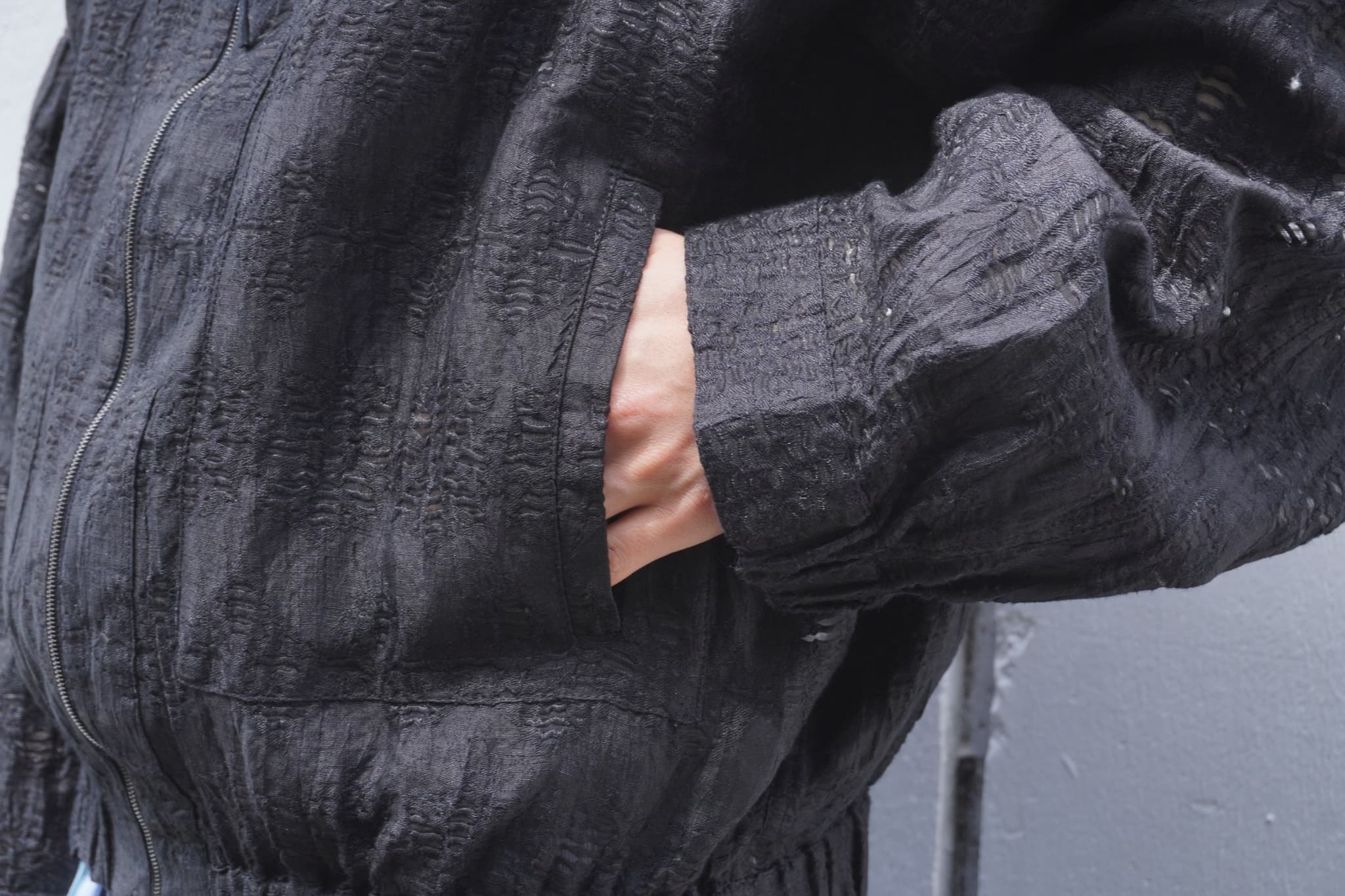 生地量を多めに取り、ゆったりとしたサイズ感とドロップショルダー、マチ付きで前振りの袖が特徴的。