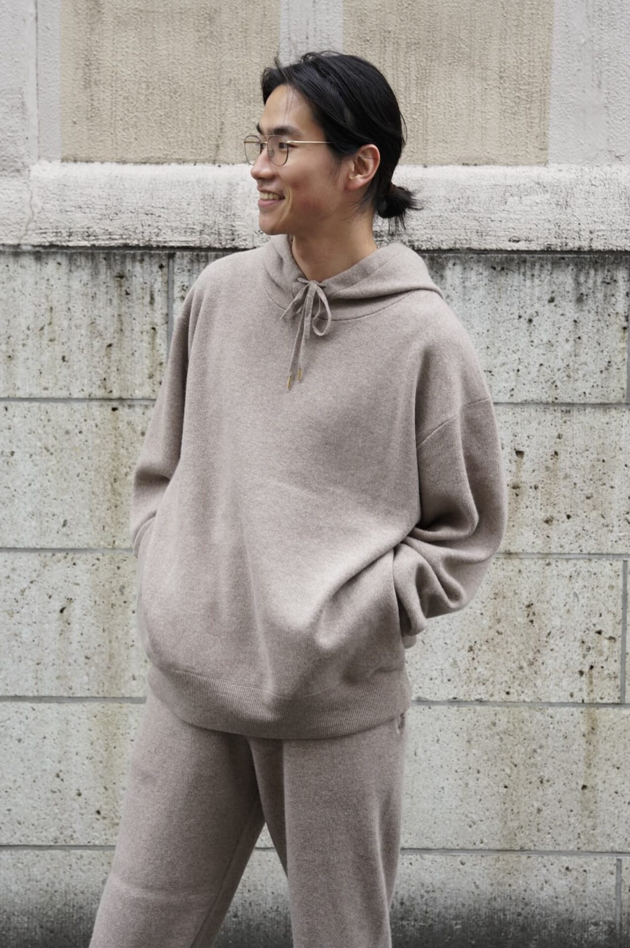 ウール70%,カシミア30%の紡毛糸を先程のスウェットと同様、12Gのスムース編みで仕立てしっかりとした肉感に仕上げることで、立体的な綺麗なシルエットに。