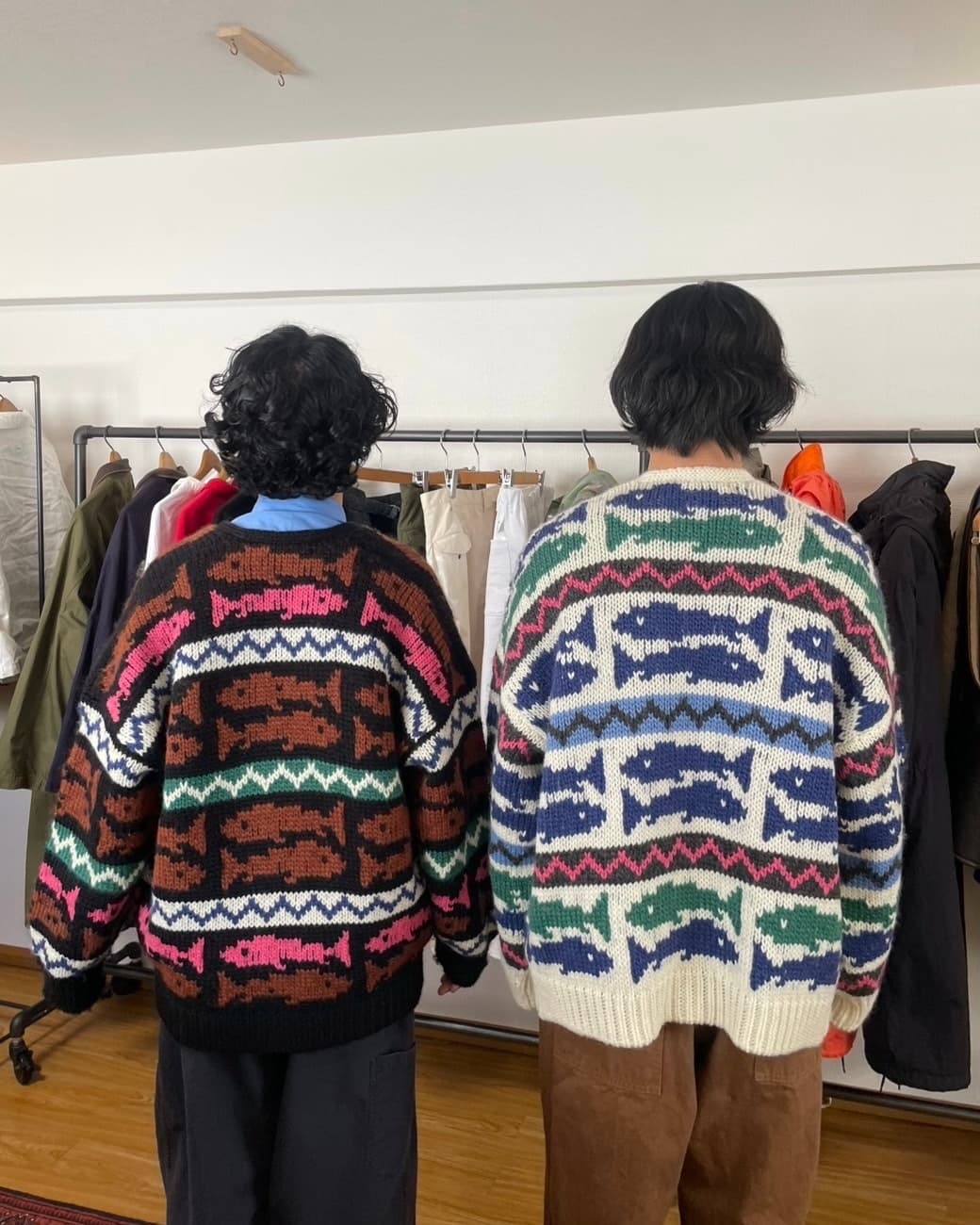 油抜きがされたようなガシガシウール×手編み、加えて鮮やかなカラーパターン、この手のニットが大好物で、きっと世界で一番似合うと勝手に思っている自分としては、絶対にバイイングしたいとチームのみんなに話したのを覚えています。