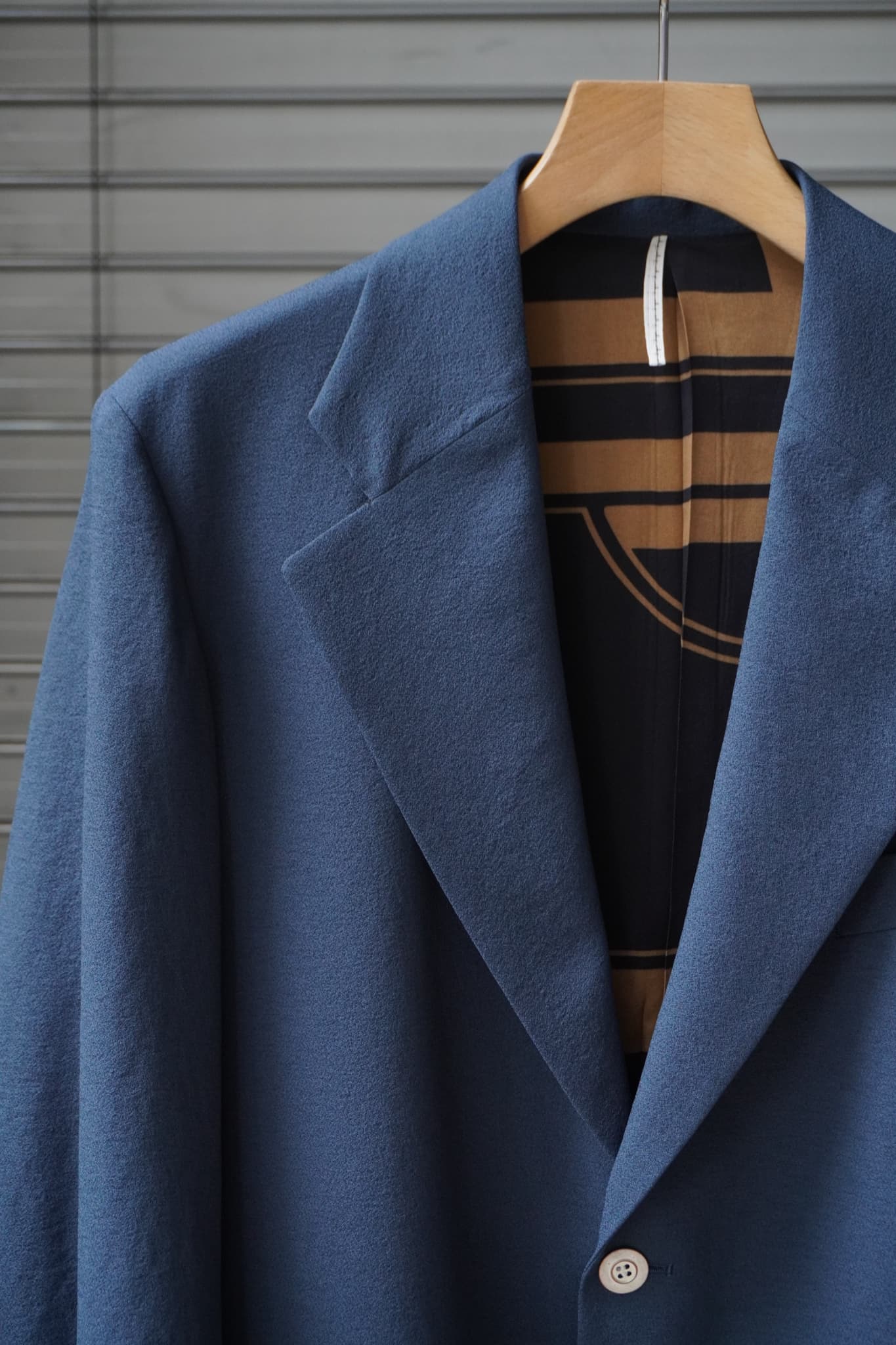 さらに、背抜き仕様の裏地にはフランスのパリにて見つけたデッドストックのプリント生地を、釦にはフレンチヴィンテージのメタル釦をそれぞれ採用。