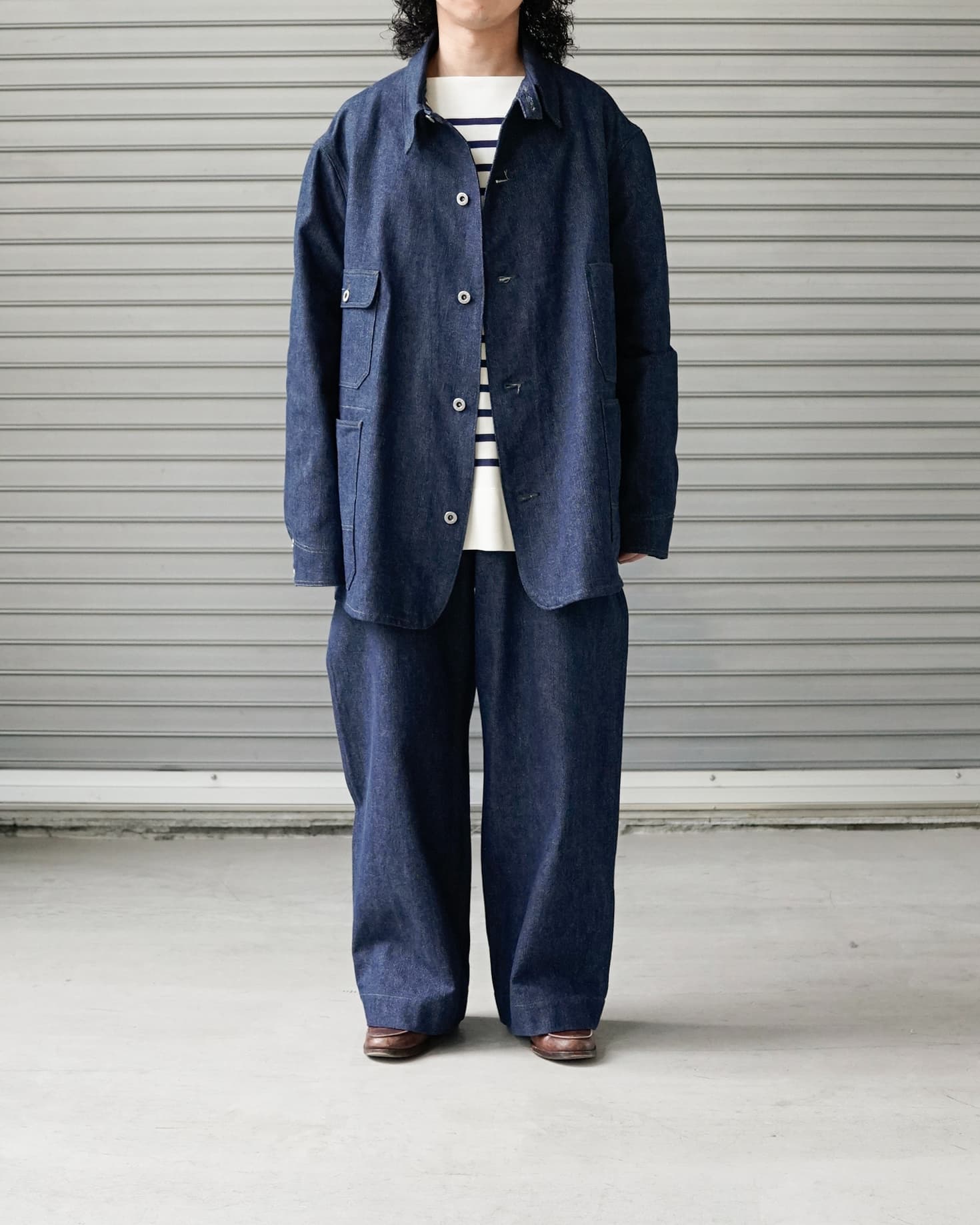 撚り杢の糸を使ったデニムのセットアップでシンプルにスタイリング。