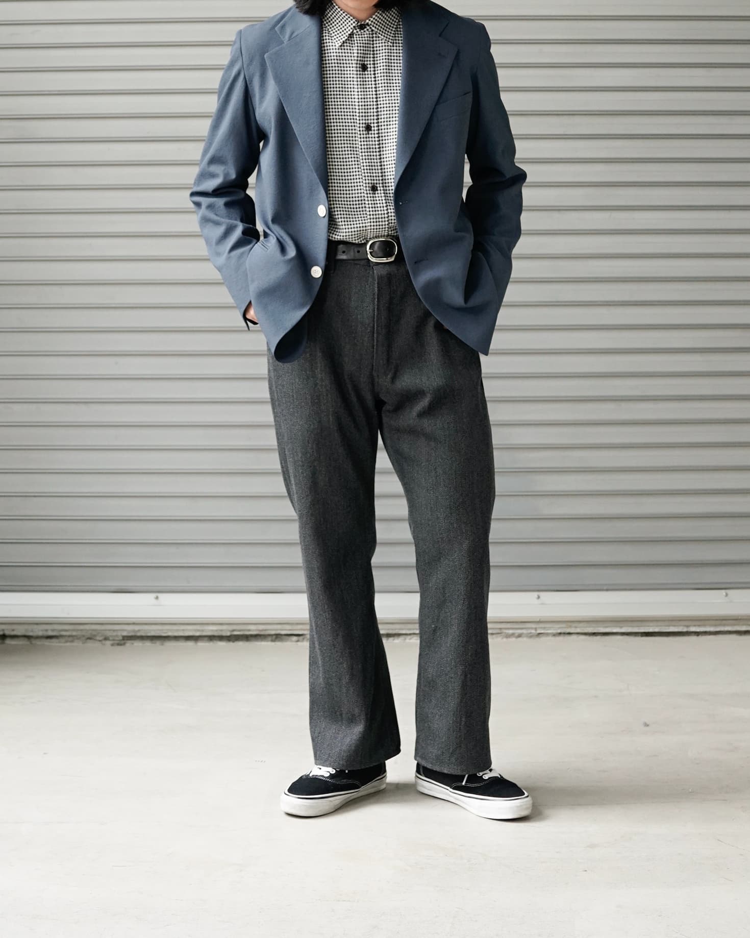 千鳥柄のモールスキンシャツにテーラーメイドのジャケットを。パンツもワークすぎない綺麗なシルエットでの全体像を目指すべく、フレアのシルエットでスタイリングしています。加えて、この足元に僕らならvansかなと。