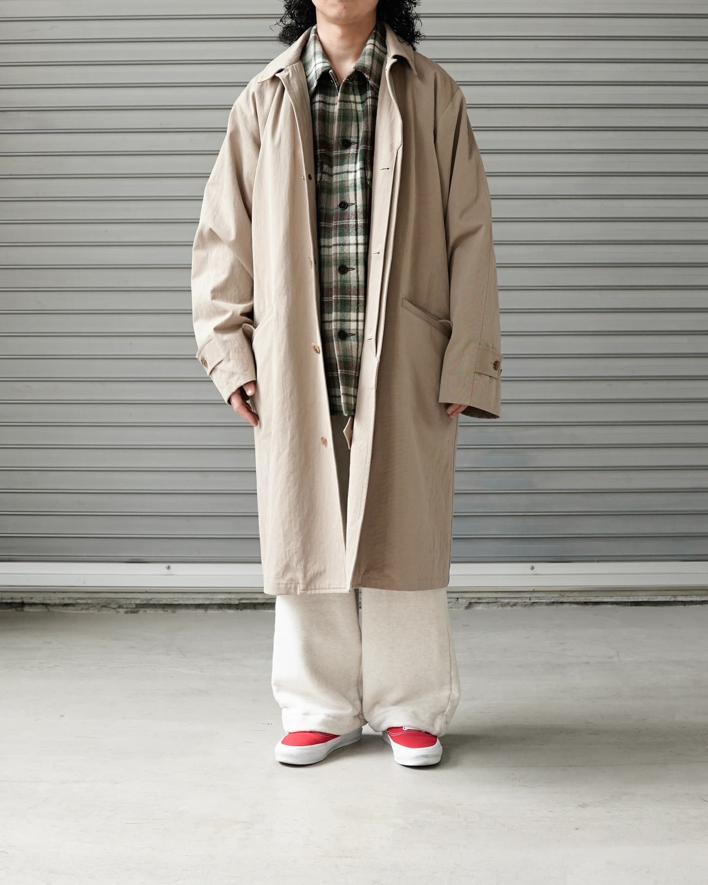 コートは先述のチノパンと共地でふっくら丸みのあるシルエット。中のシャツは写真ではわかりにくいですが、CPO型なので、いわゆるシャツジャケットタイプ。