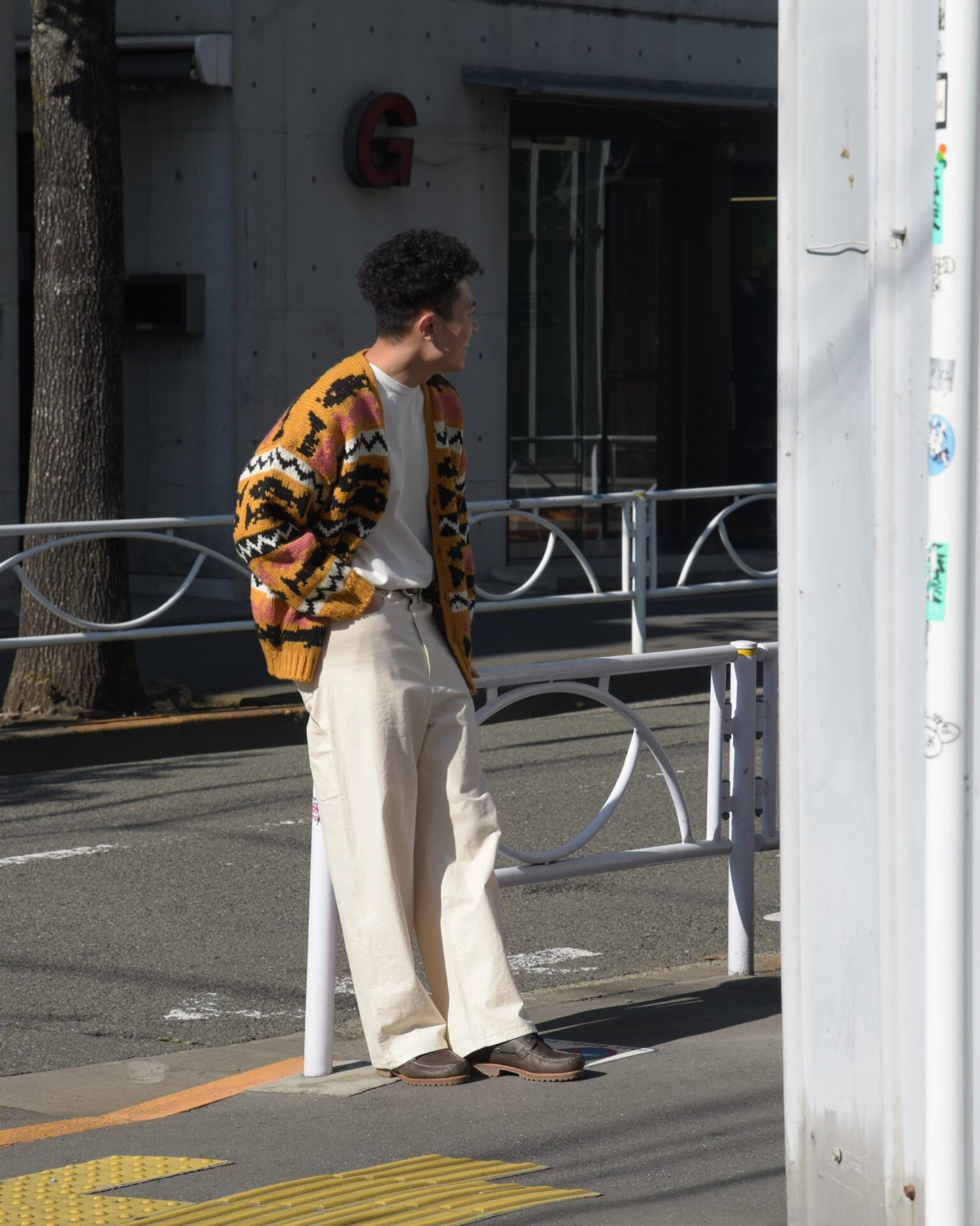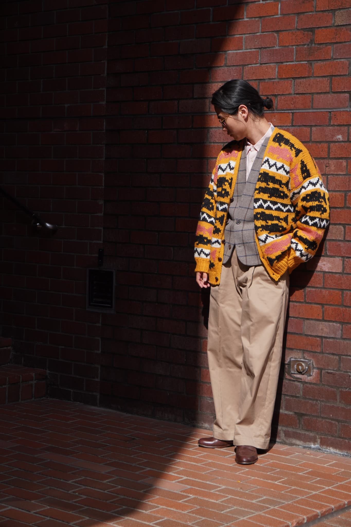 ピンクのシャツで色を拾いつつ、アースカラーの同系色でまとめる。足元は革靴でAOYAMAらしさを残してくれている彼らしいスタイリング。ええですね。