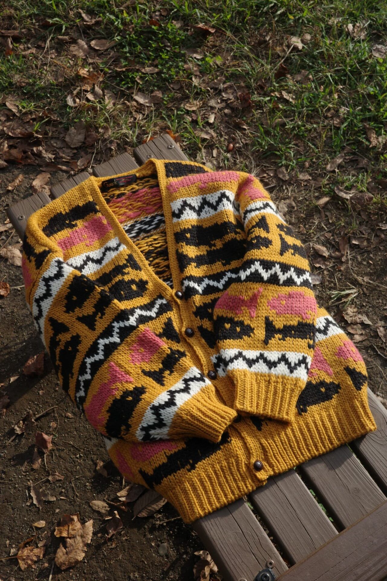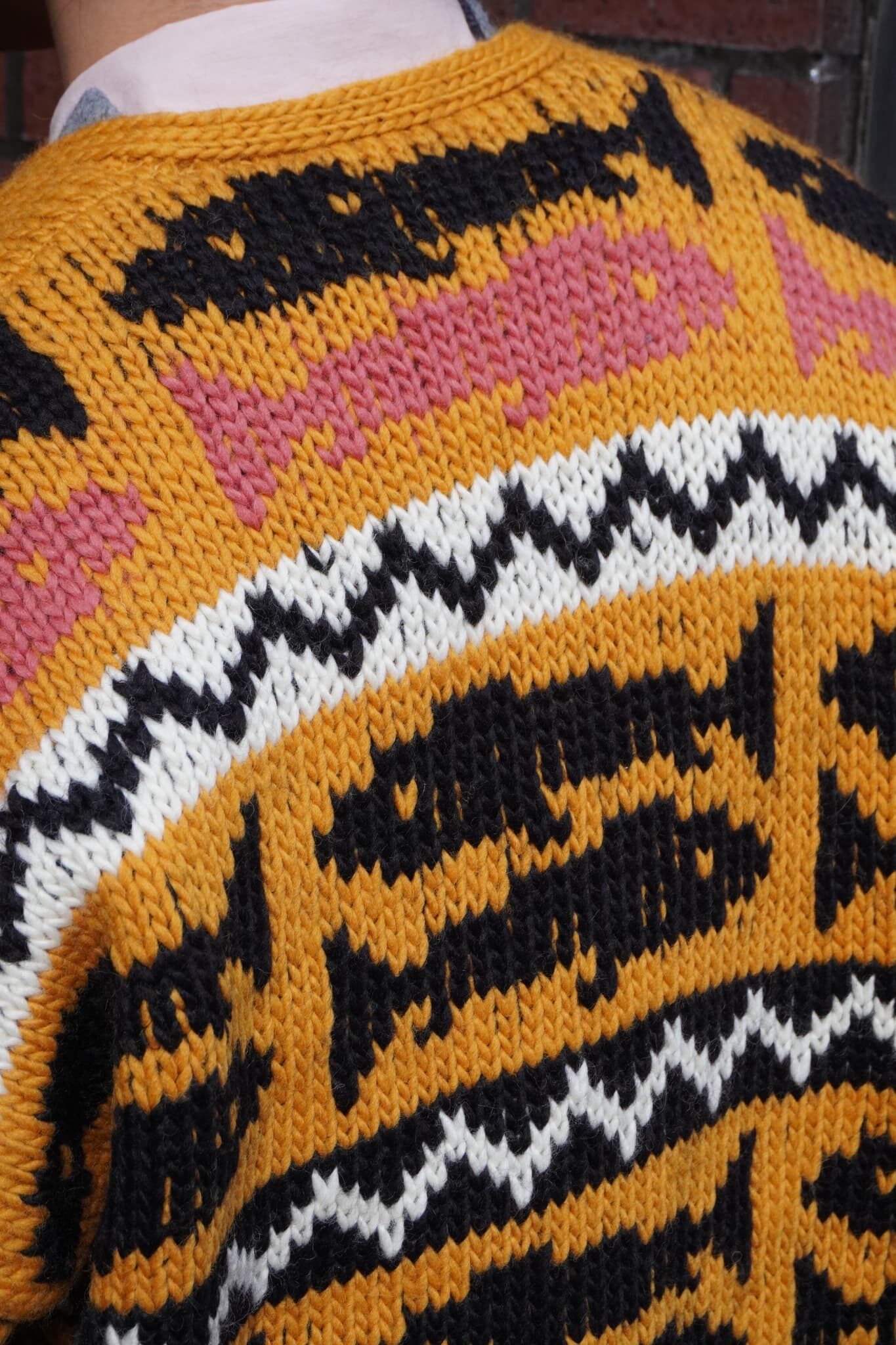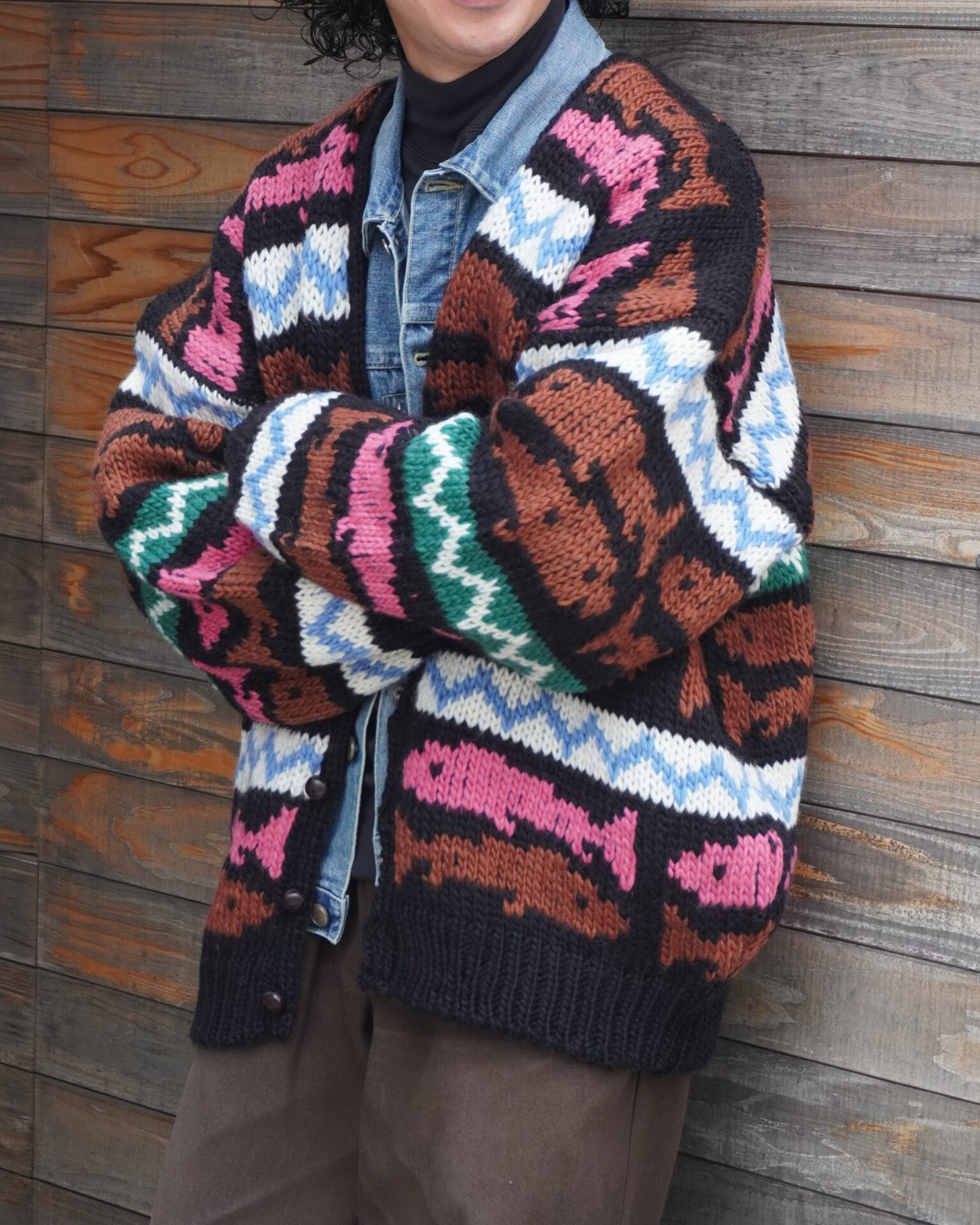 油抜きがされたようなガシガシウール×手編み、加えて鮮やかなカラーパターン、この手のニットが大好物で、きっと世界で一番似合うと勝手に思っている自分としては、絶対にバイイングしたいとチームのみんなに話したのを覚えています。