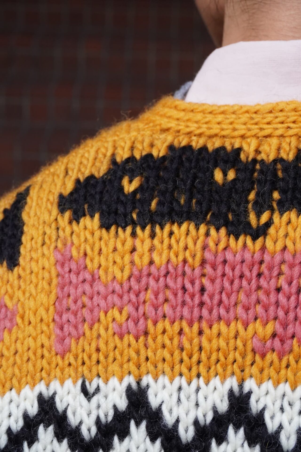 天竺編みの偶然の一目でできた、個体差とも言えるイラスト部分の他色糸の混入がまた愛おしい。