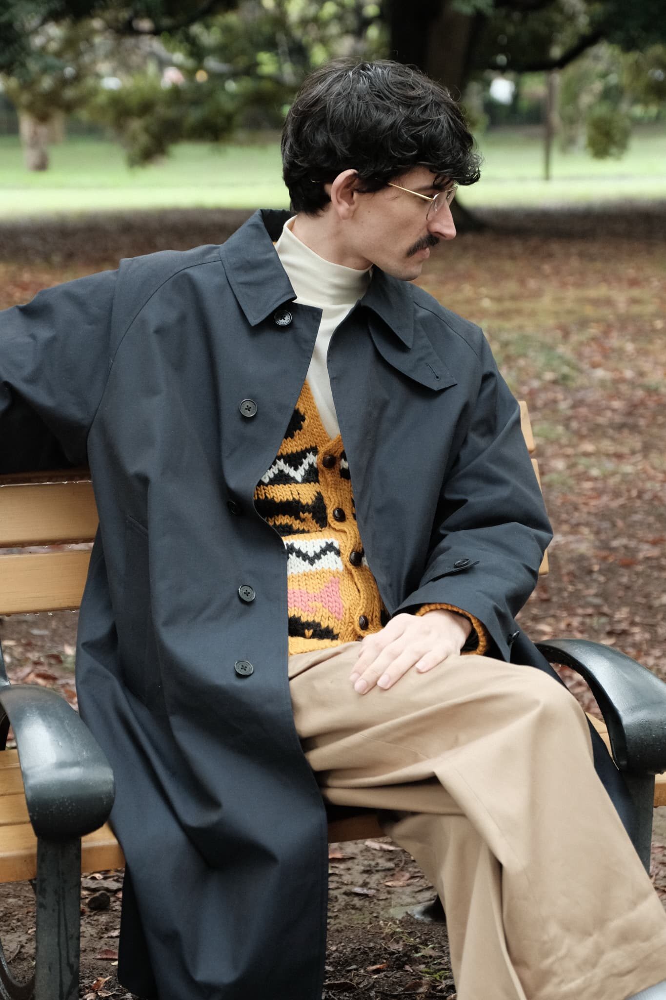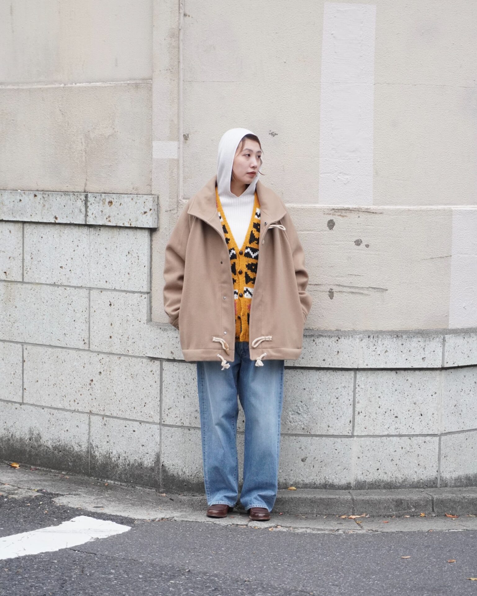 先述しましたが、脇ハギがない分どの角度から見ても見た目がとても綺麗。だからこそモックネックにコート、革靴にキャップでやりすぎてない感を狙いました。