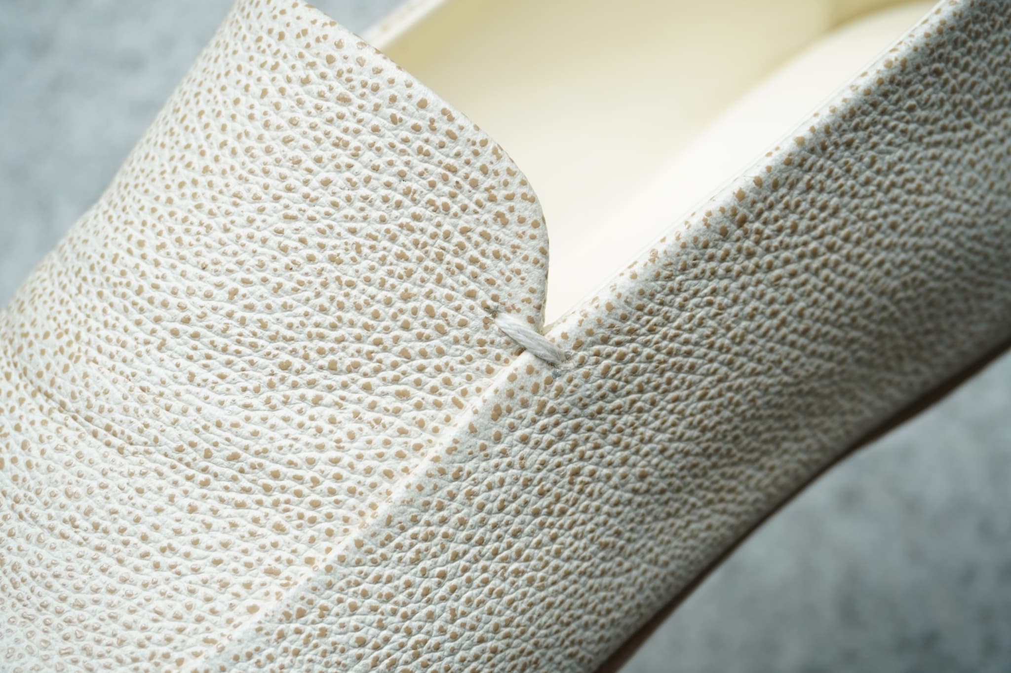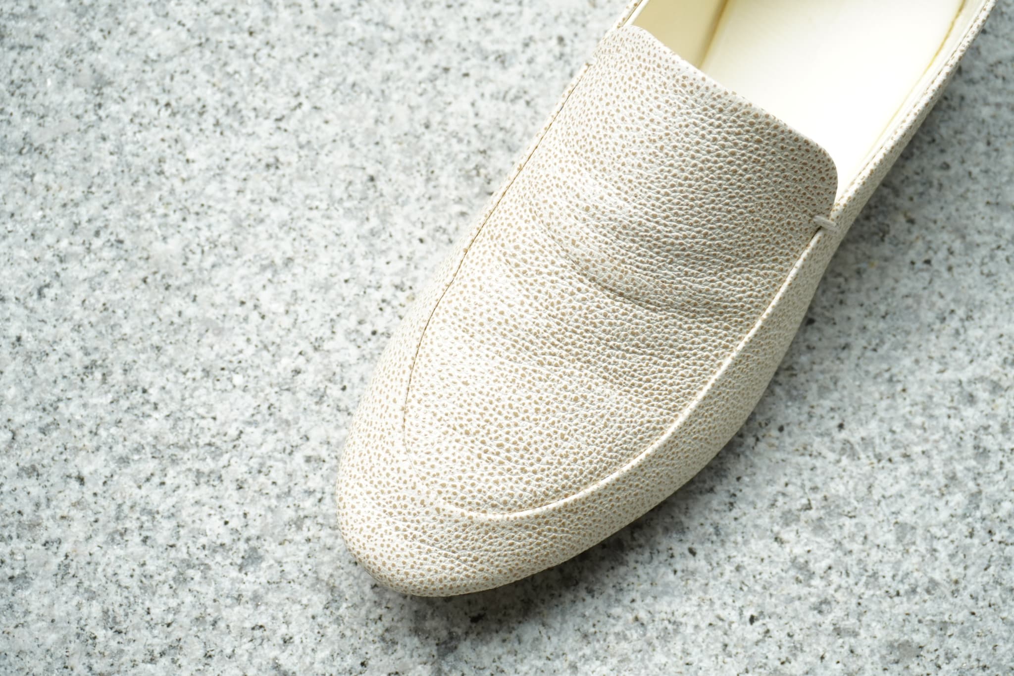 こちらの白の素材は桟革。全体の白いクリーンな印象はそのままに、日本の伝統さも相まって渋さも際立つ、いいとこどりな一足。