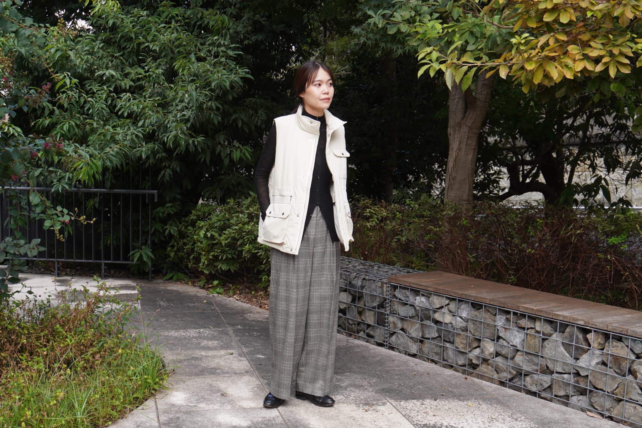 スタッフ河野はパデッドベストをメインにスタイリング。