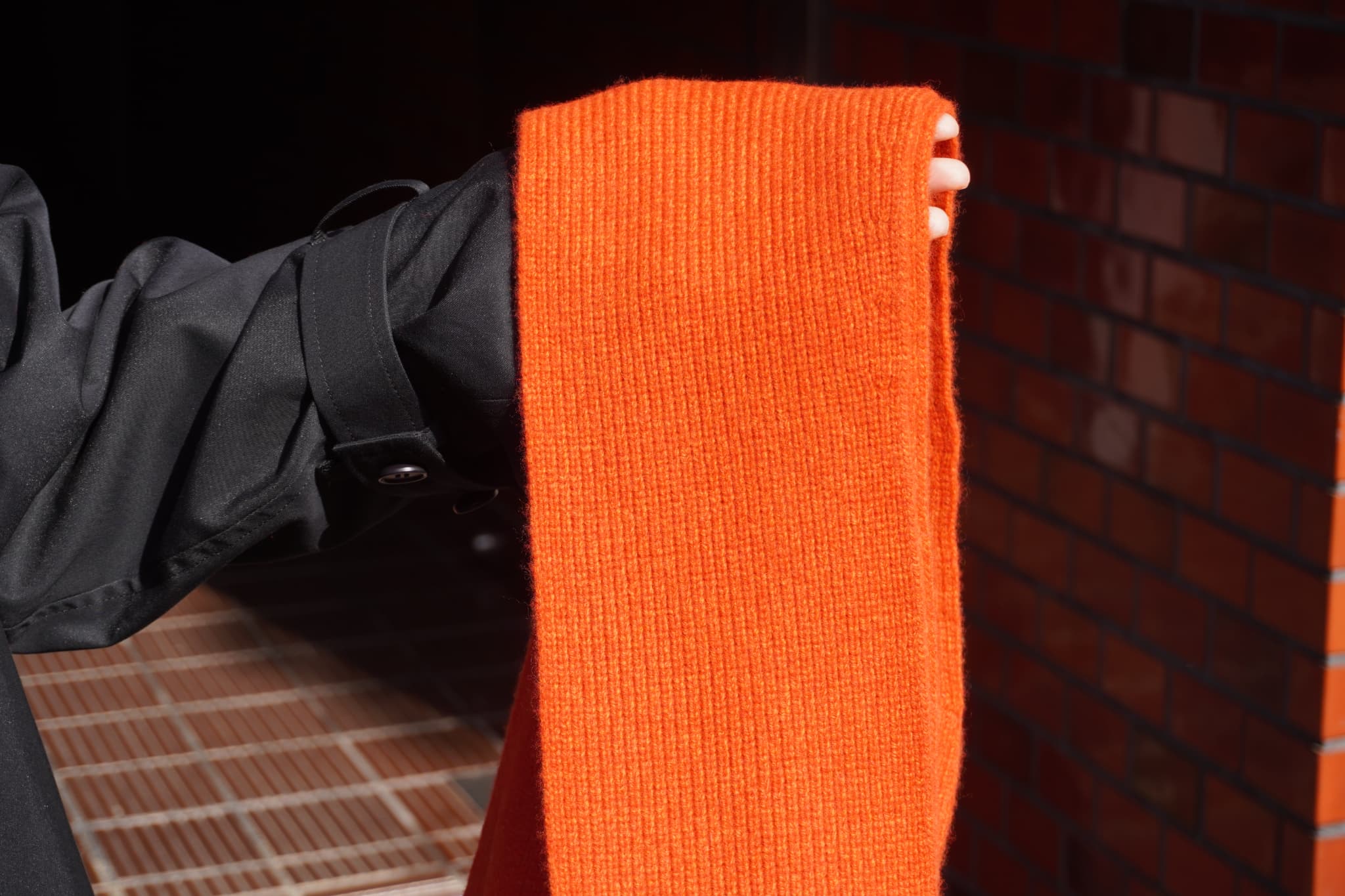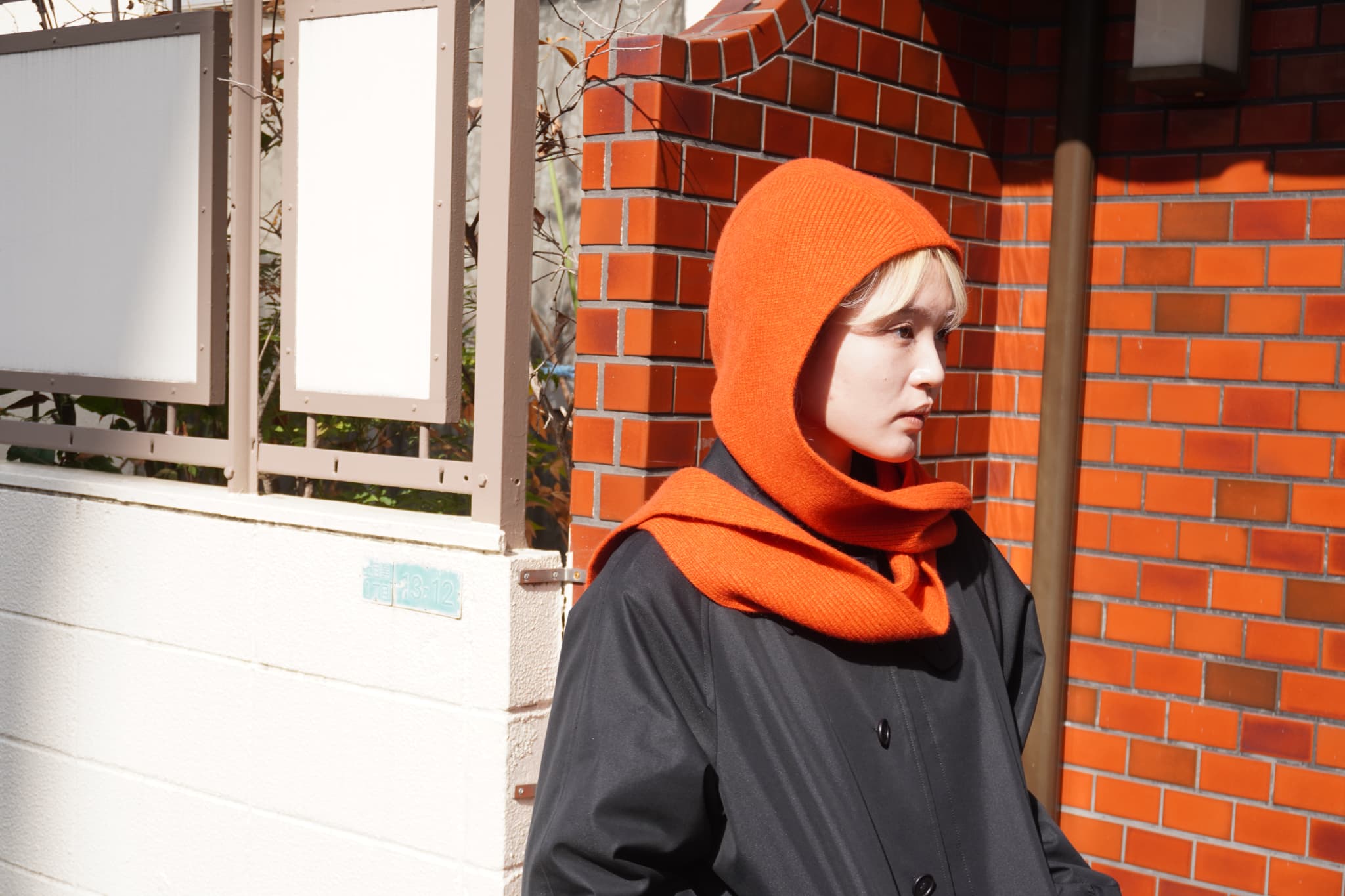 まず目に入ったであろうこちらのスカーフは、シルクウールの糸で編んだマフラー付きバラクラバ。
