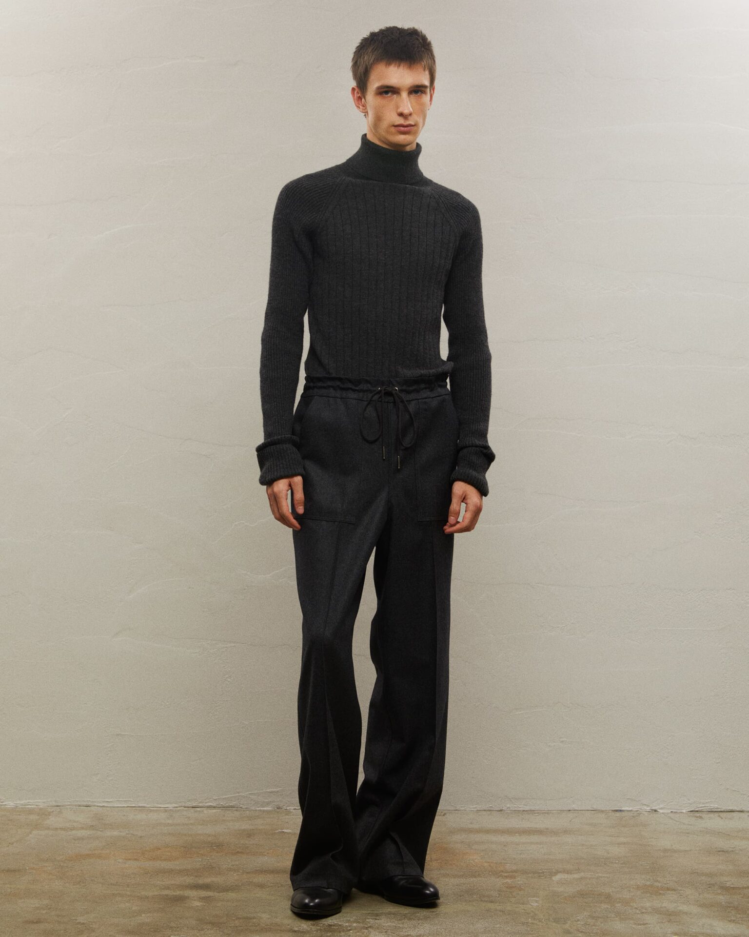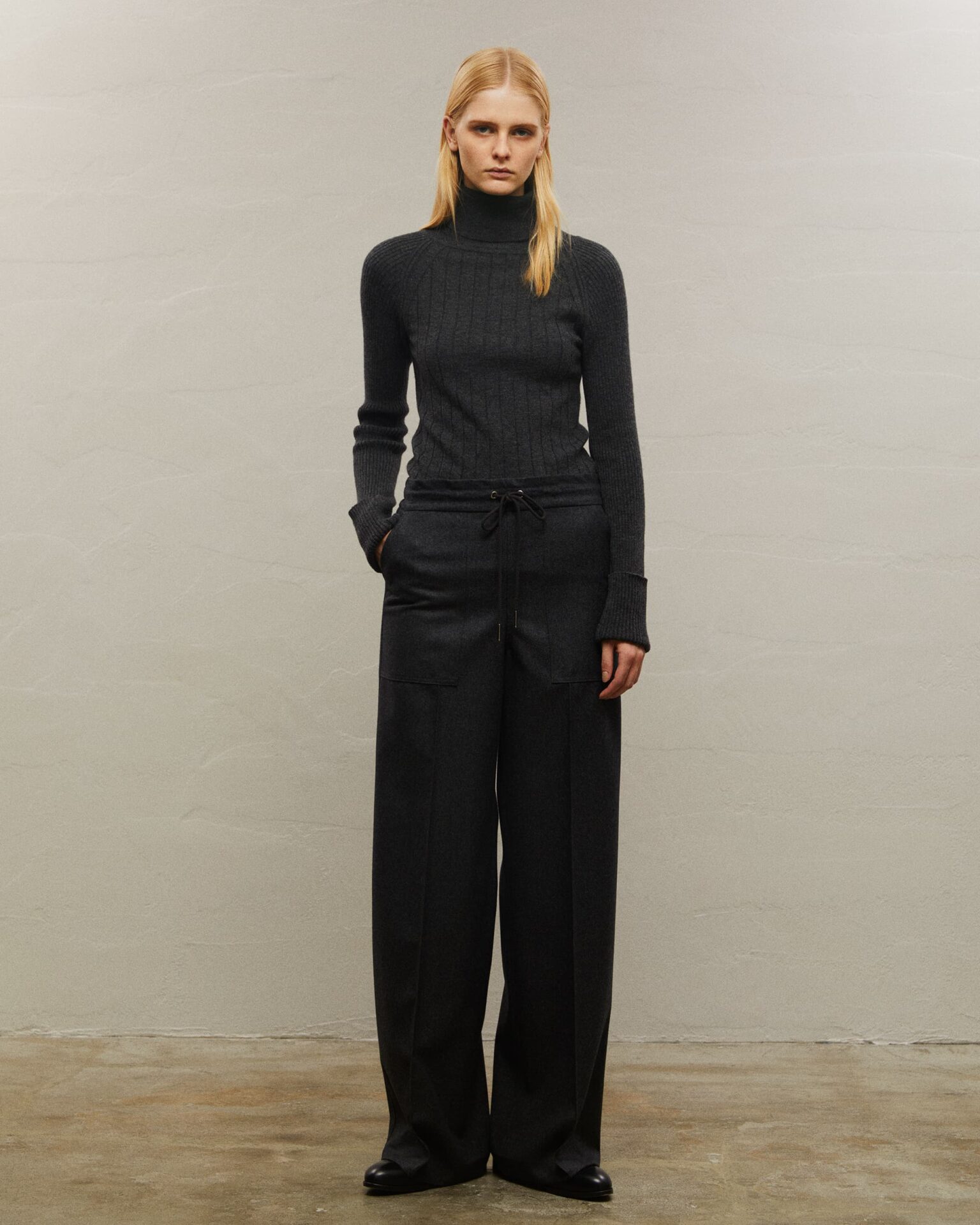 すっきりとしたモックネックと、ゆったりとしたドロップショルダーのシルエットが特徴的。柔らかなメリノウール素材を用いています。