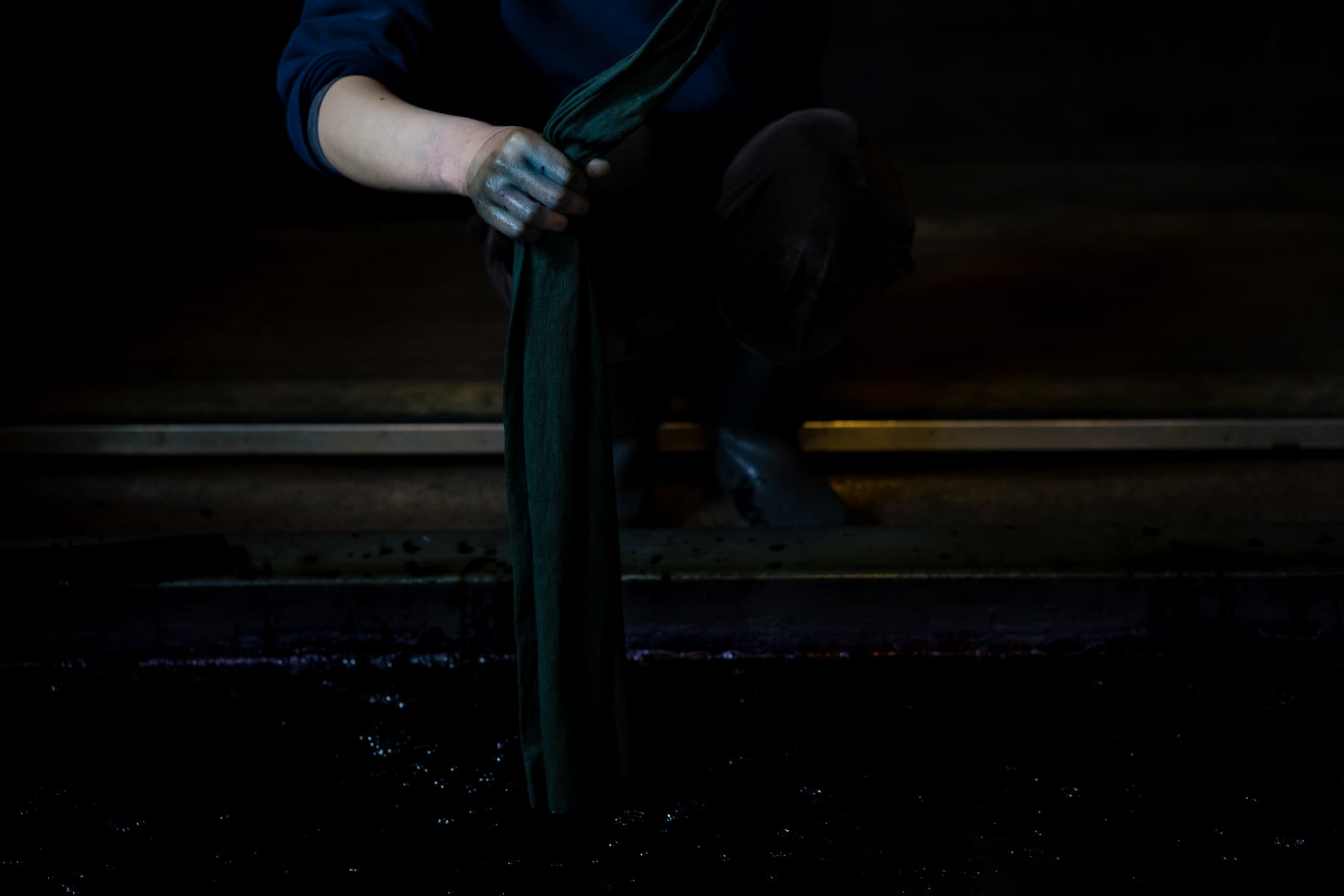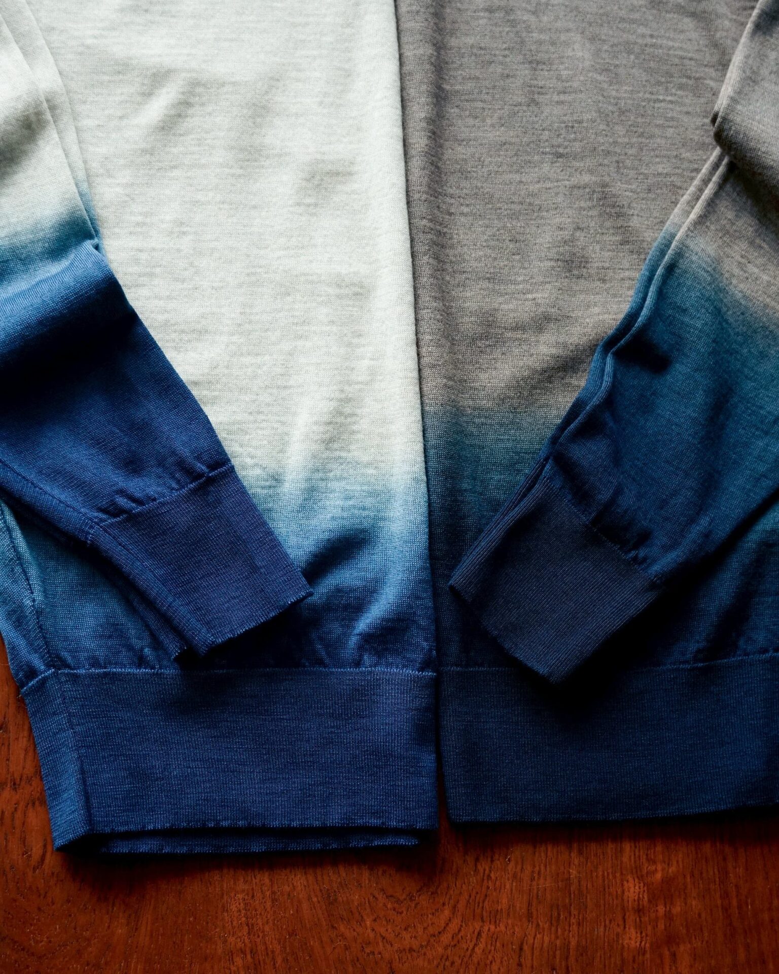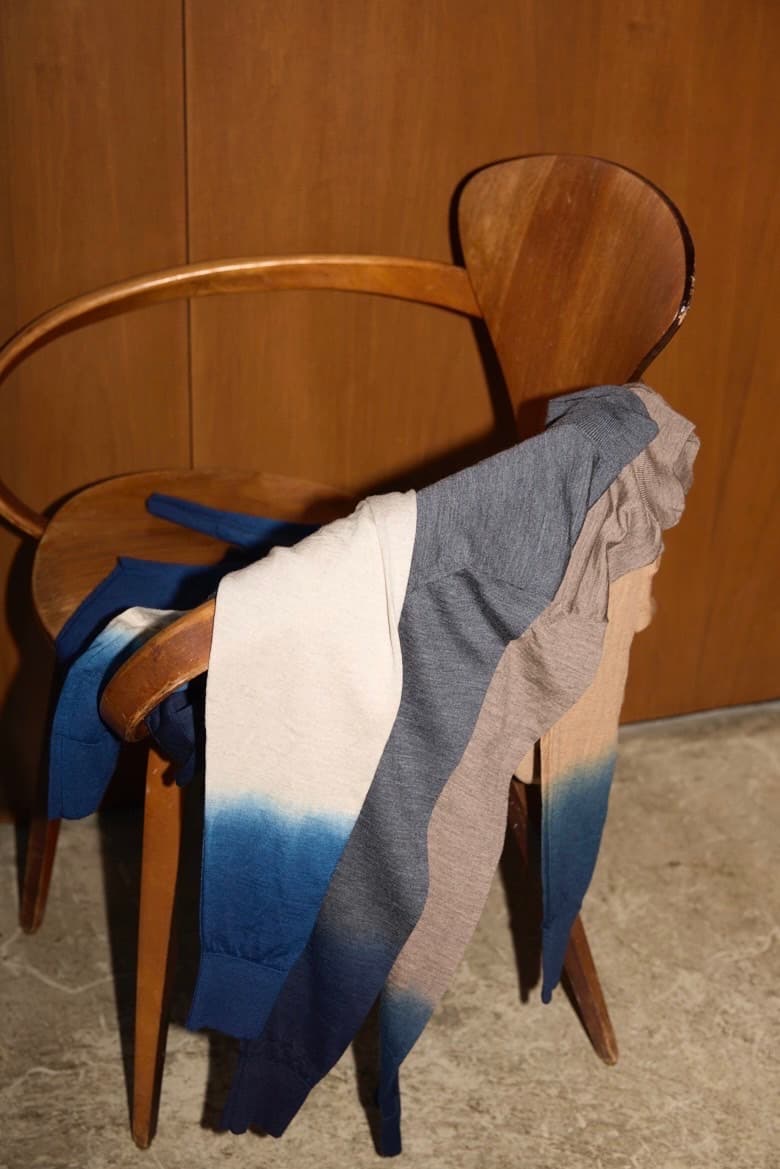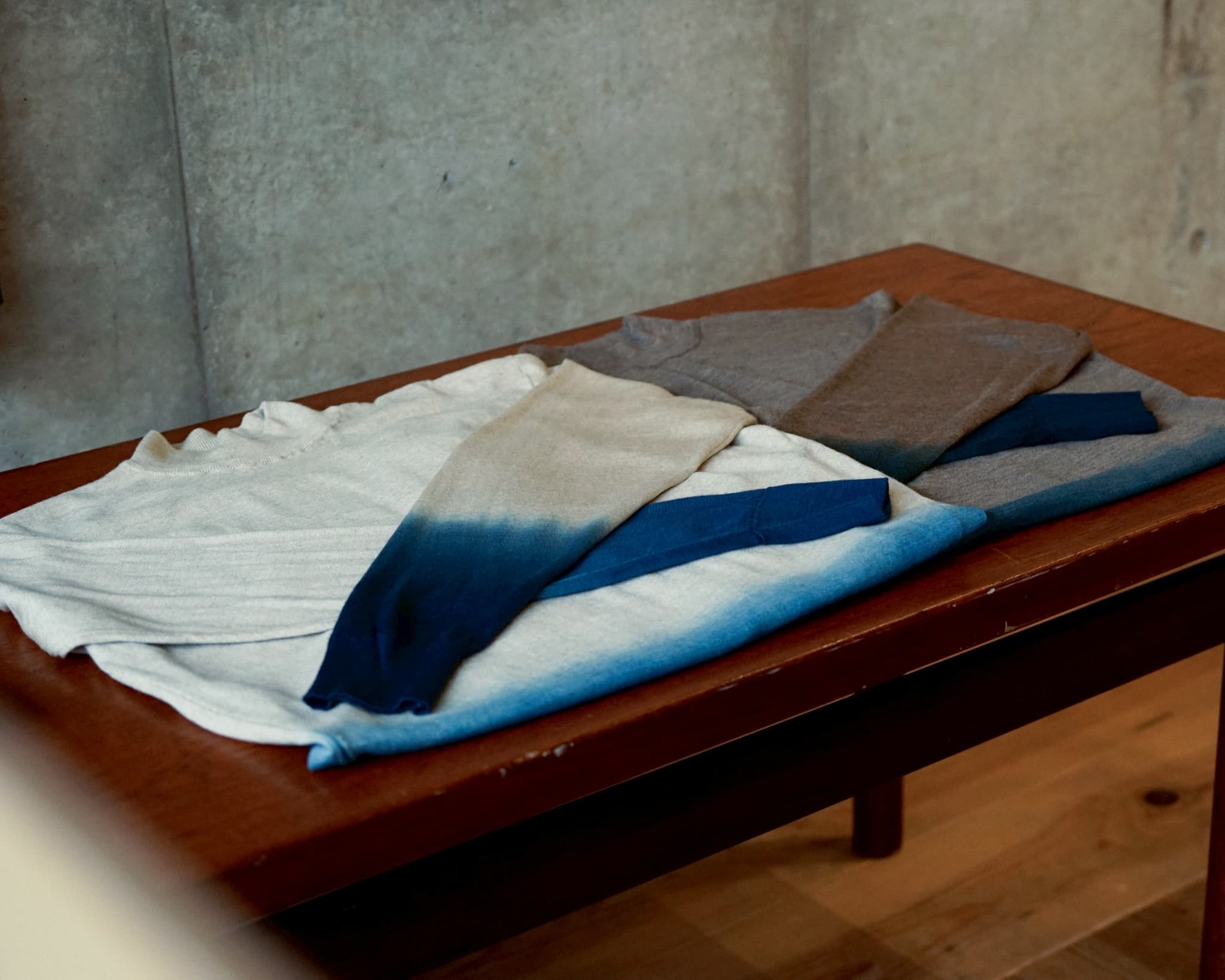 この工程によりアイテム全体を見た時、生地の色味のグラデーションが完成します。