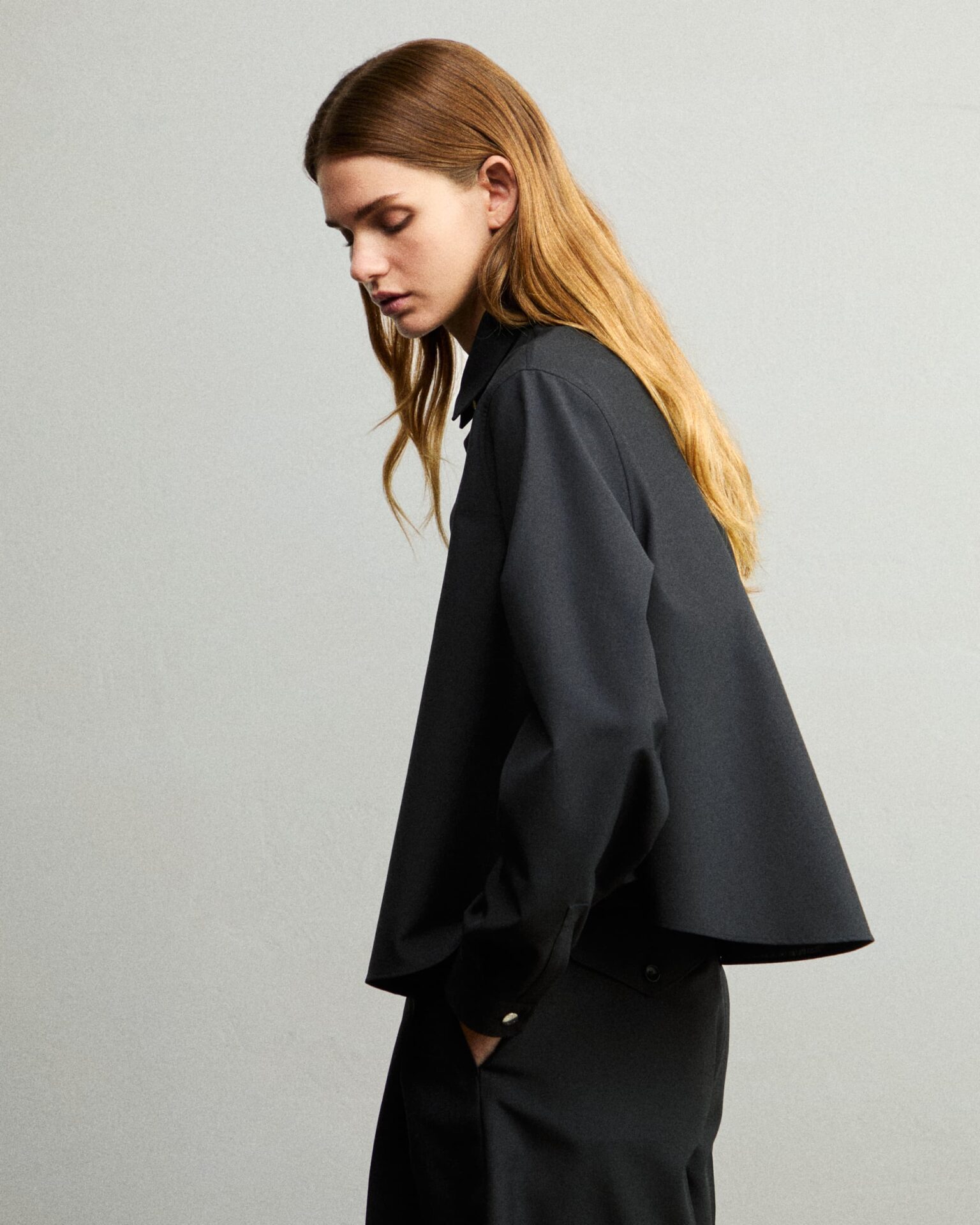 レディースのシャツは、商品名の通り、コンパクトな襟元に対して裾に向かって大きく広がるエレガントなシルエット。