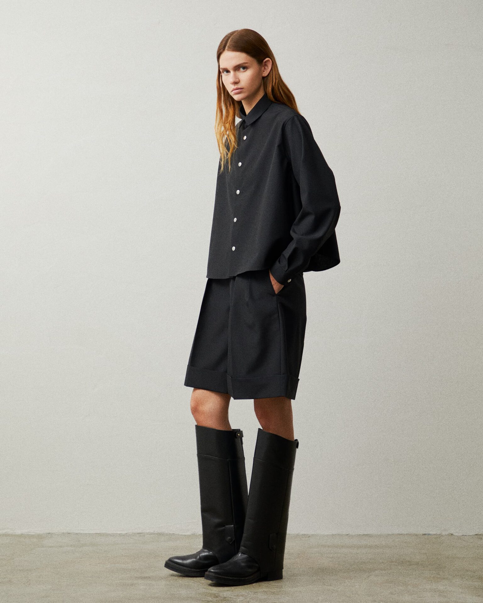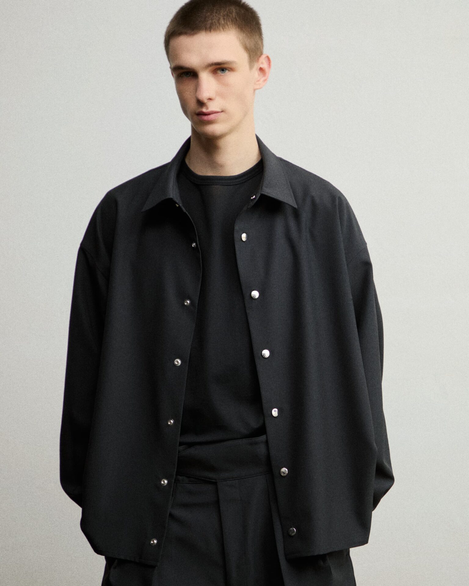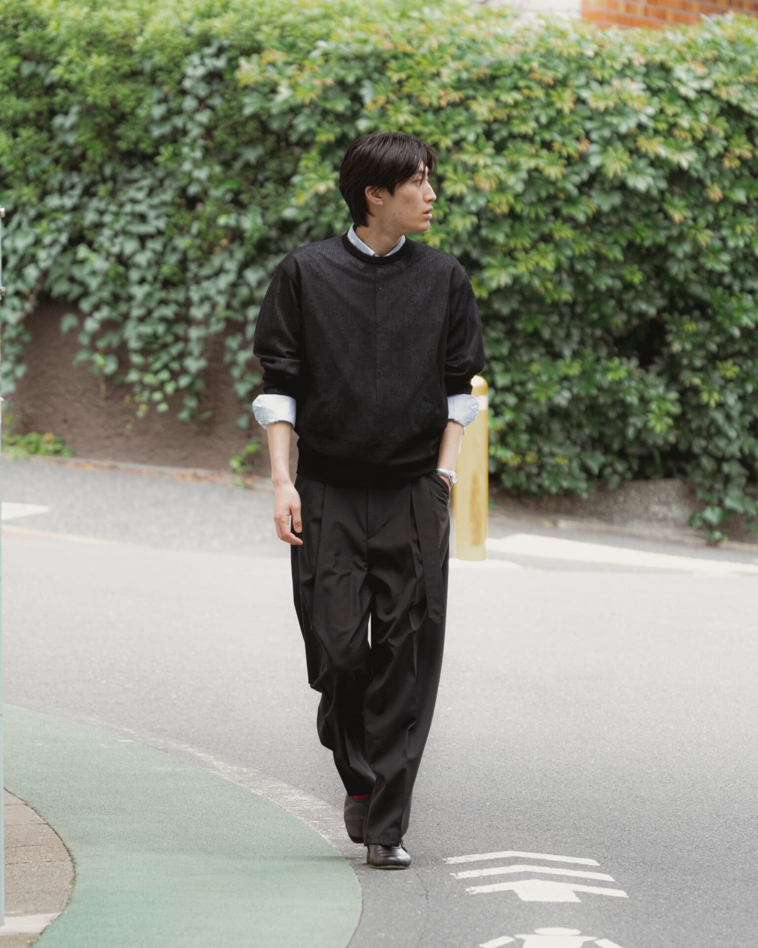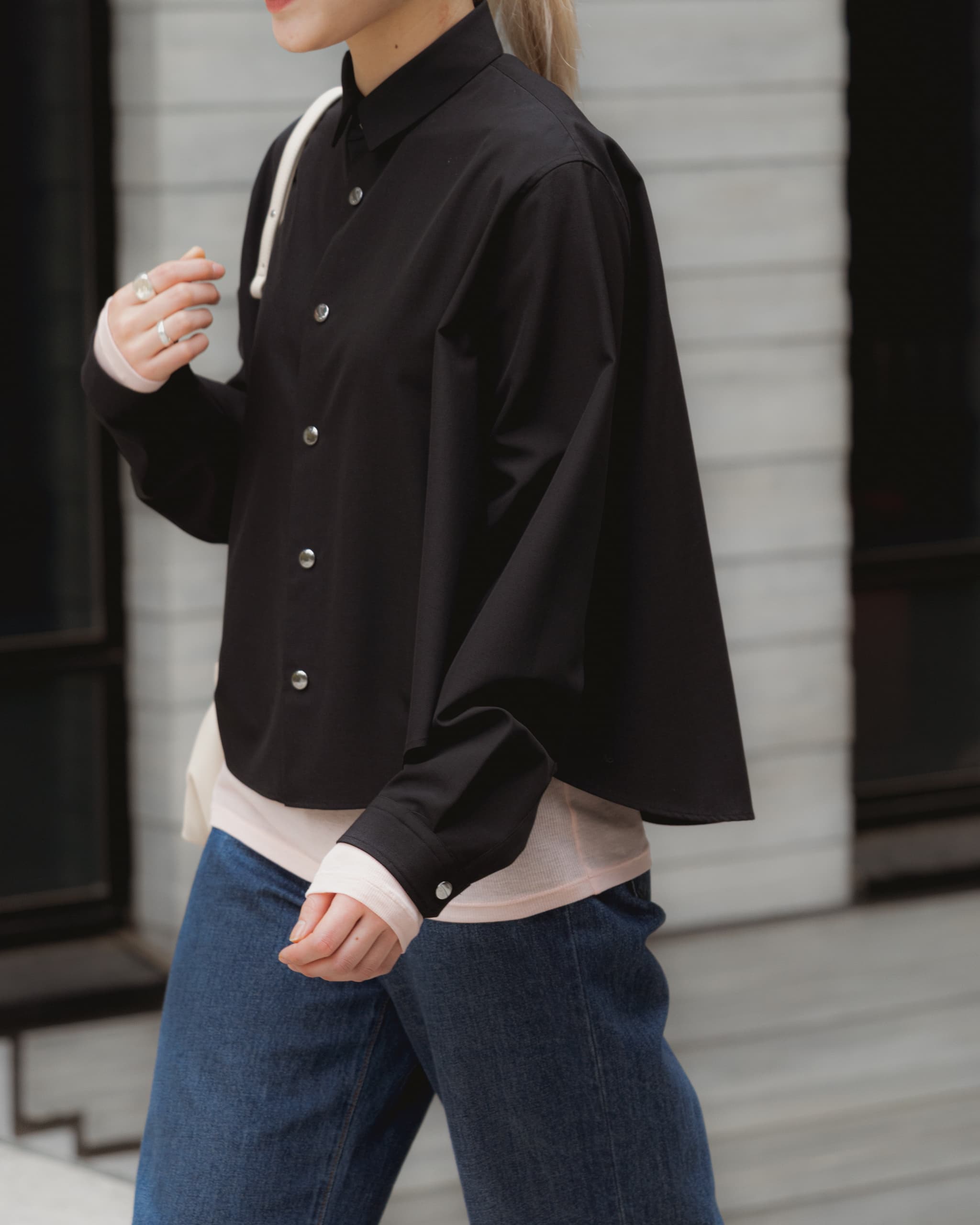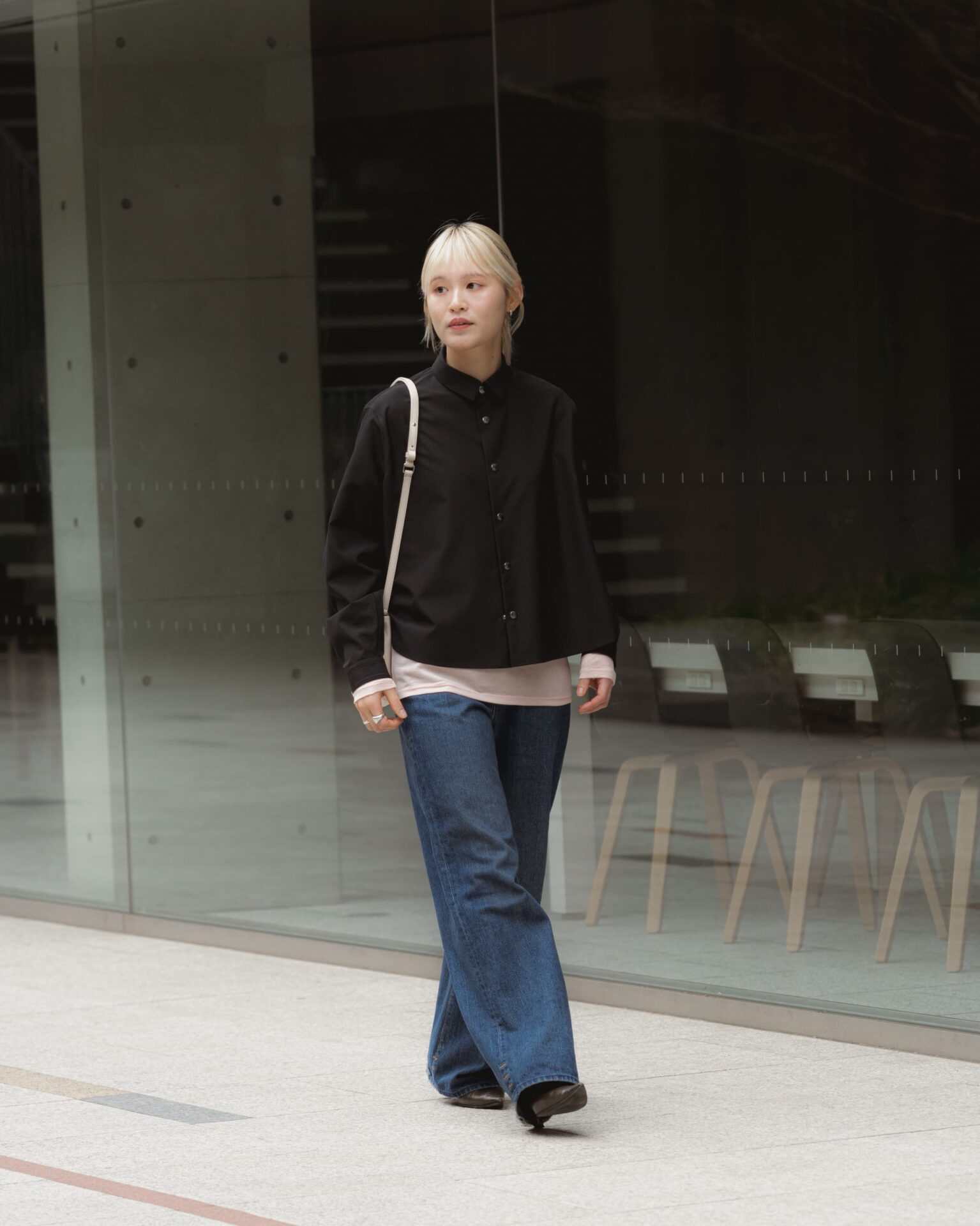 シェイプの入らない身頃や太めのアームホールなど全体的にゆったりしたサイズ感で仕立てながら、着丈に関しては一般的なシャツと同等の長さにすることで、ルーズな印象に寄らず綺麗に着こなせます。