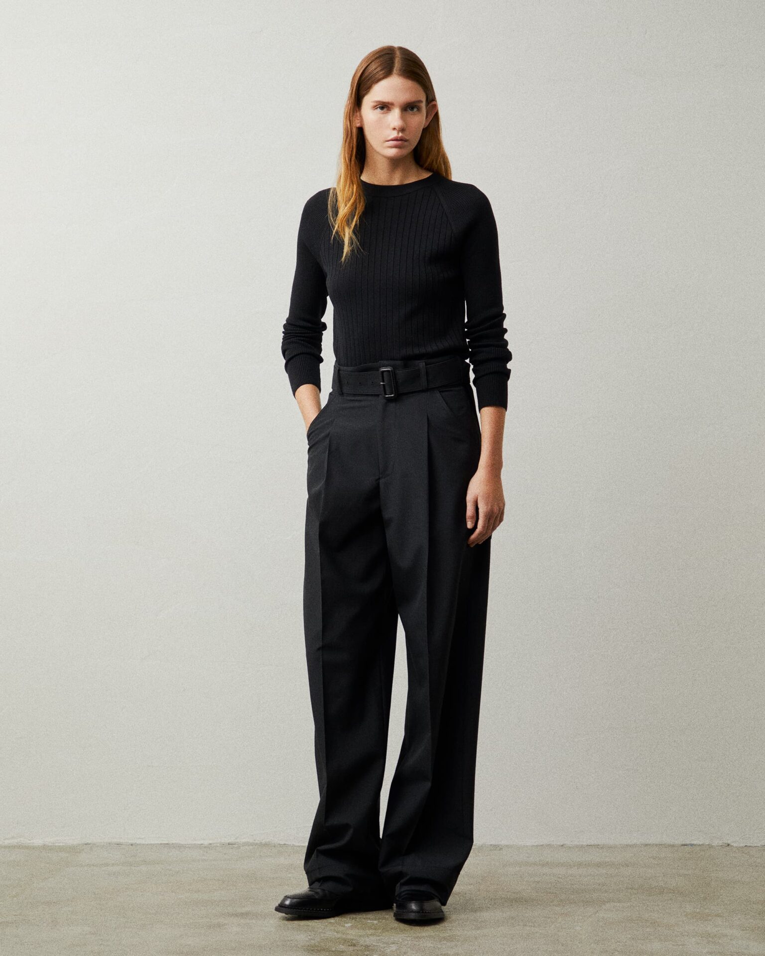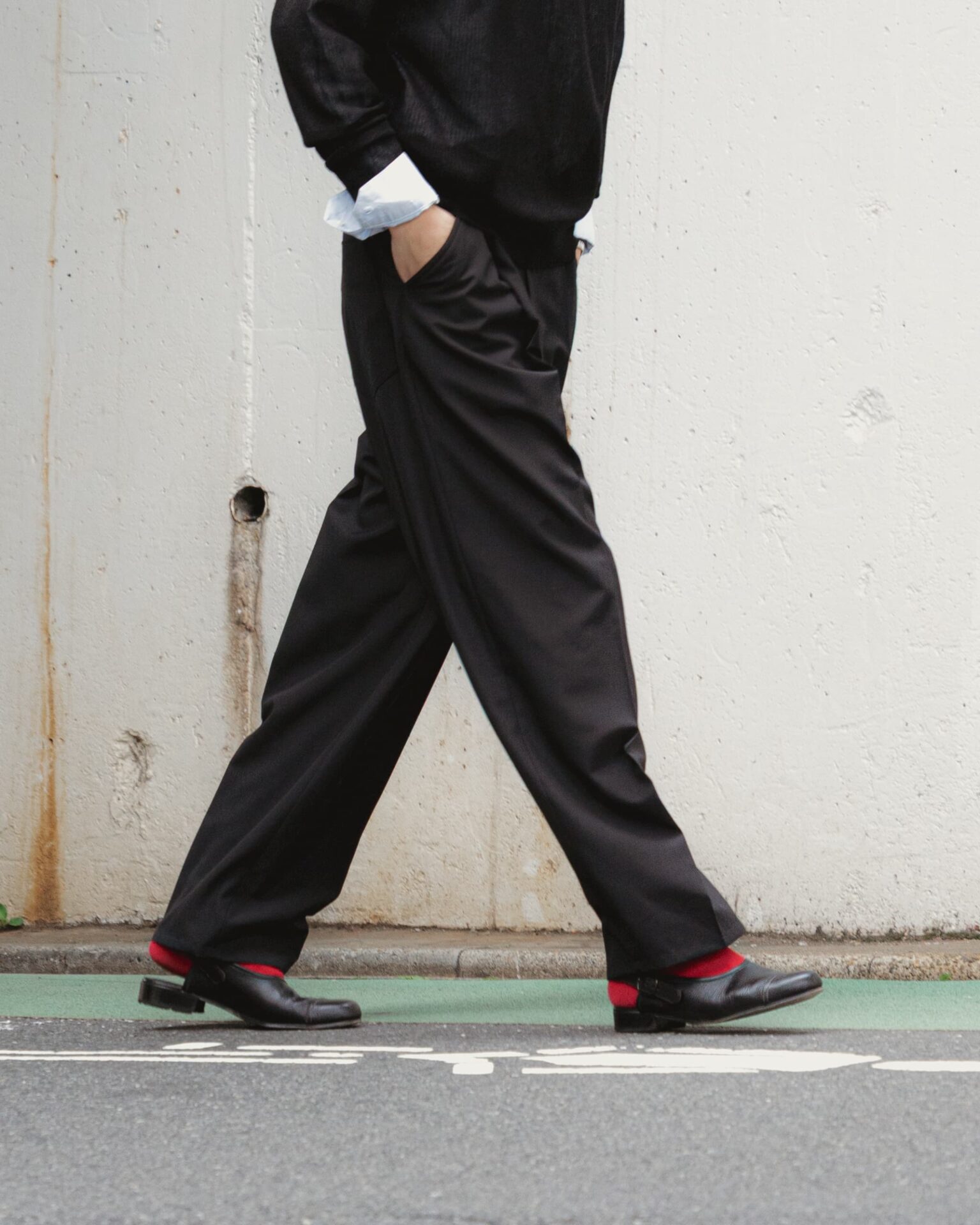 色は黒でクラッシックに。装いをまとめるときにやはり黒のパンツは必要です。