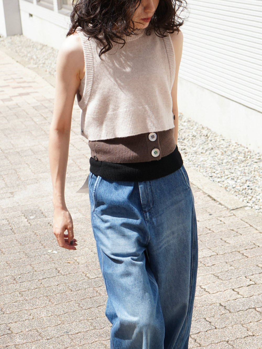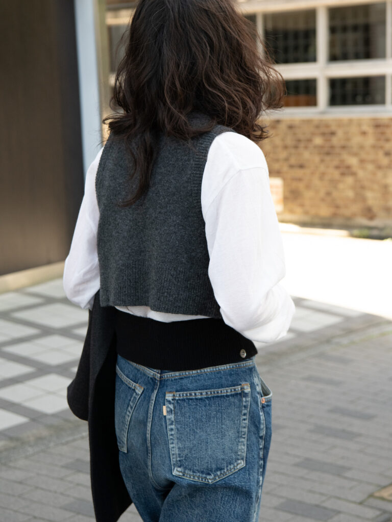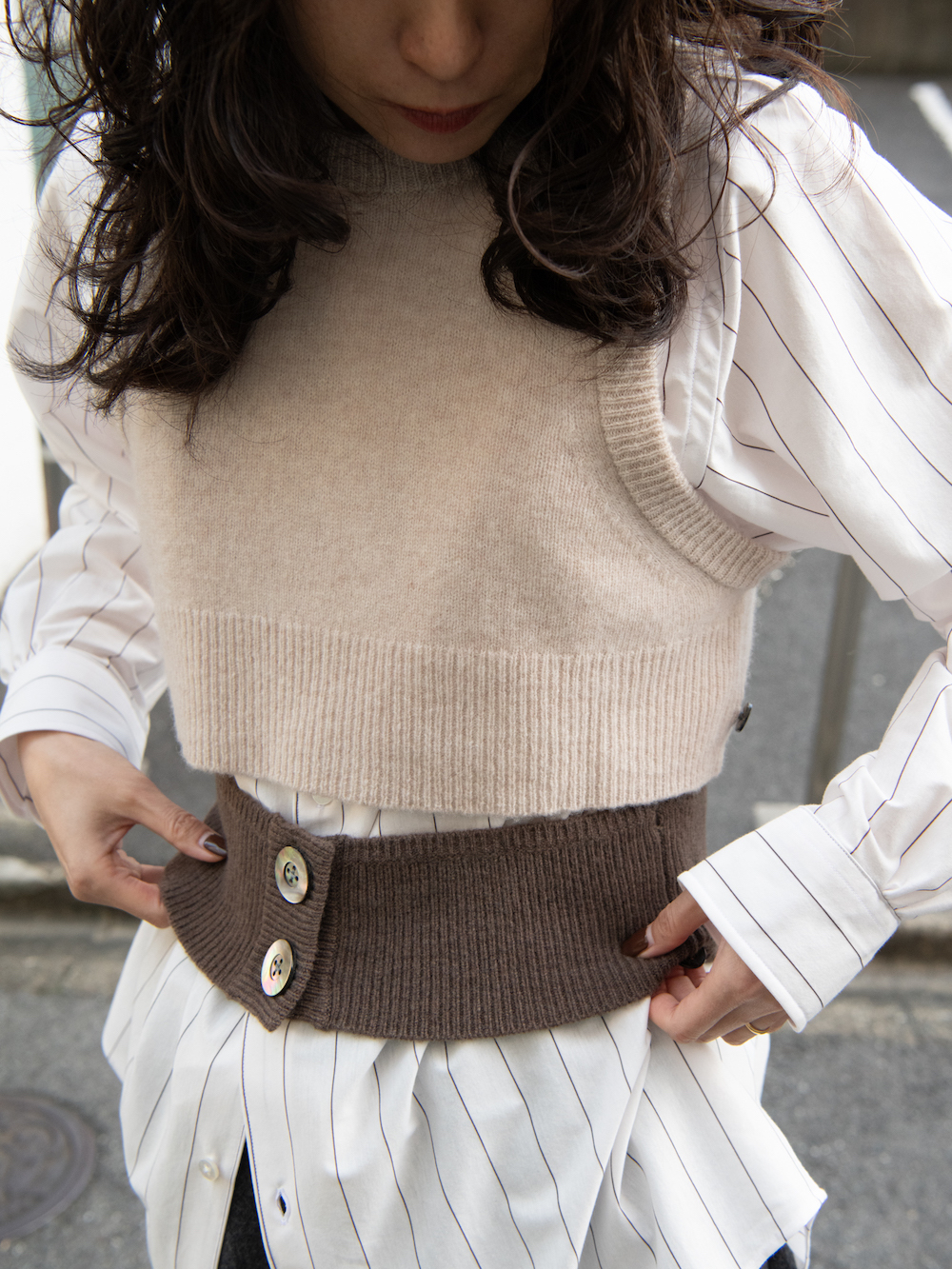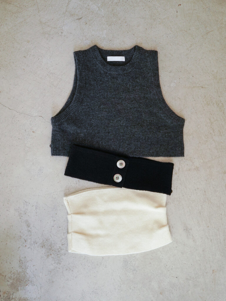 ではまずその第一弾として、こちらのKAYLEのニットベストをご紹介します。見ていただいた通り少し風変わりなデザインで、ウエスト部分が3段に分かれていて切り離された仕様になっています。