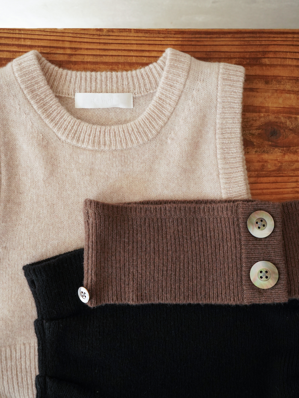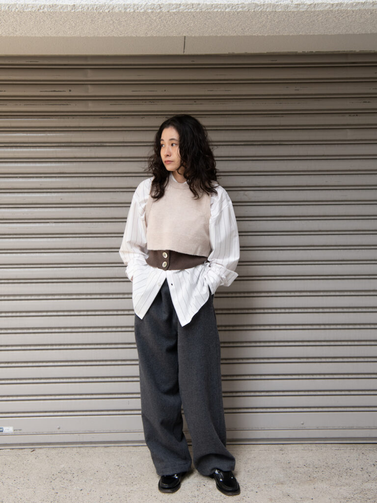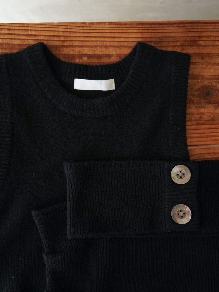 ニットベスト自体は季節かかわらずの普遍的なベーシックアイテムですが、それをKAYLE流にアレンジし唯一無二のデザインに昇華させたもの。