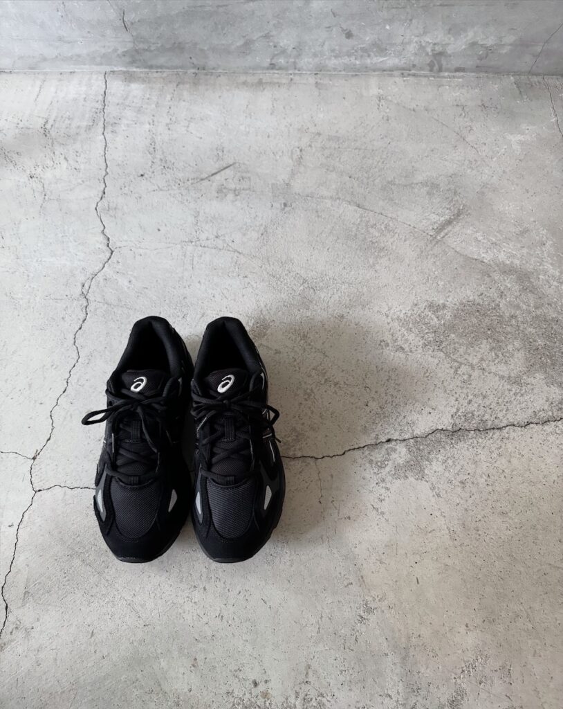 数あるアシックスの中でも、比較的スタイリッシュな形。これこそが馴染みない方にもお勧めできるポイントです。ナードすぎて芋っぽいと感じさせるメッシュのアッパーが浮き彫りに見えない黒。街着として活用するためのシャープなソール。さまざまな要因がありますが、とてもクールです。