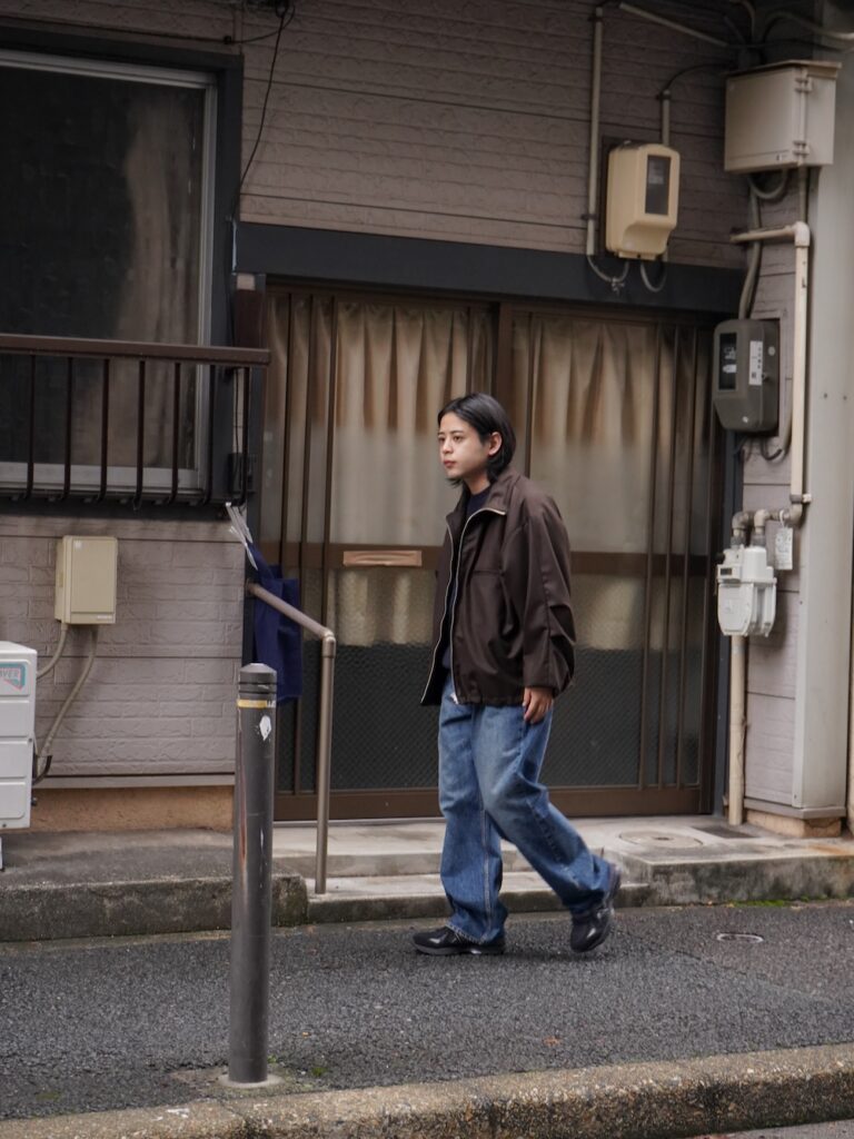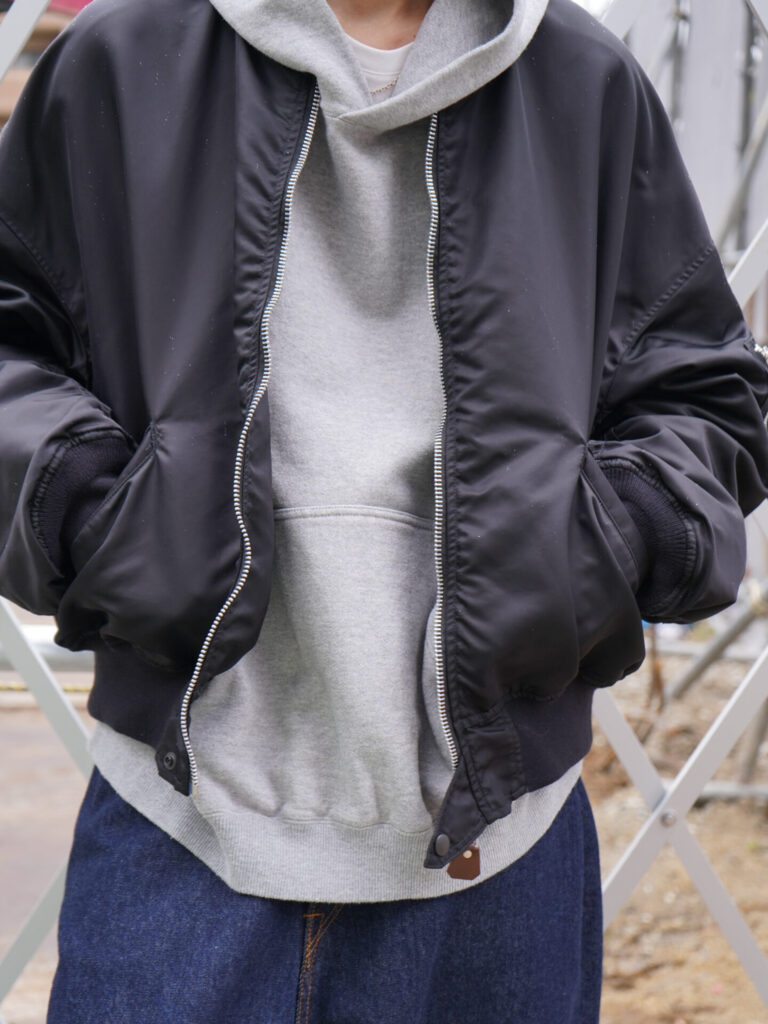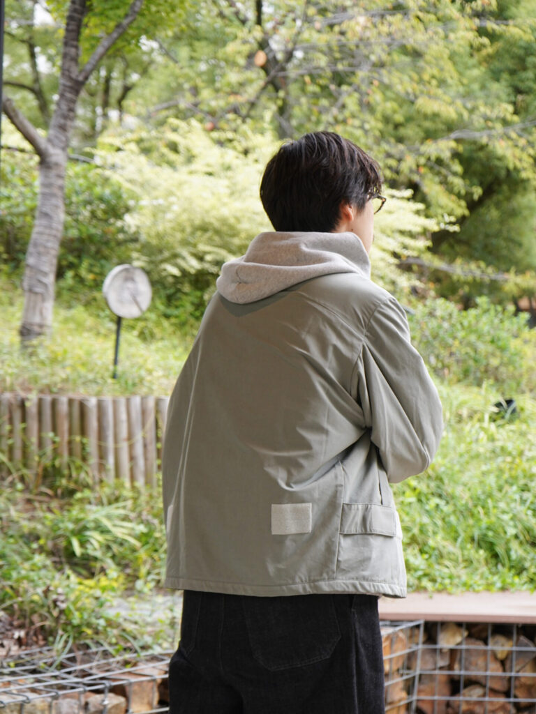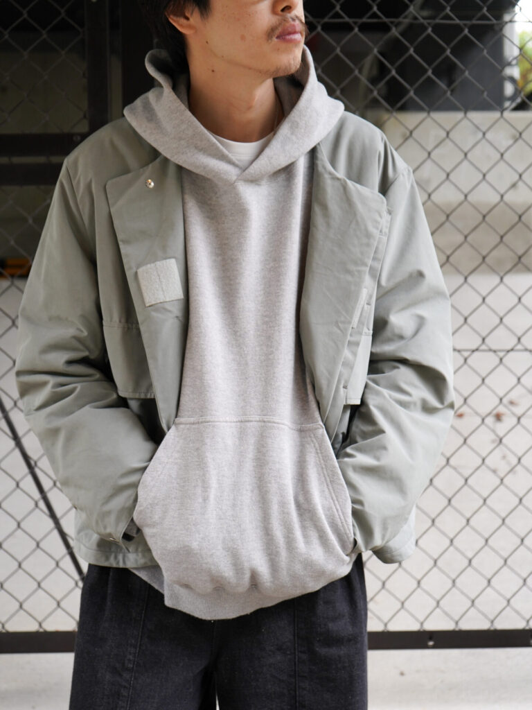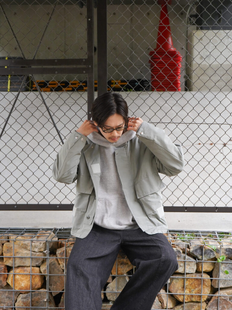 襟周りに干渉しないということでノーカラーのブルゾンもチョイスしております。フーディのスウェットはそれ自体で柔らかい印象になるので、個人的にはこの辺りのアウターで無骨さや力強さを足したいなと思っていて気にしながらセレクトしました。