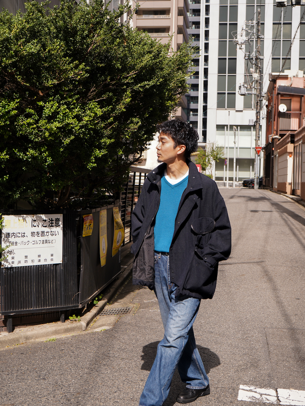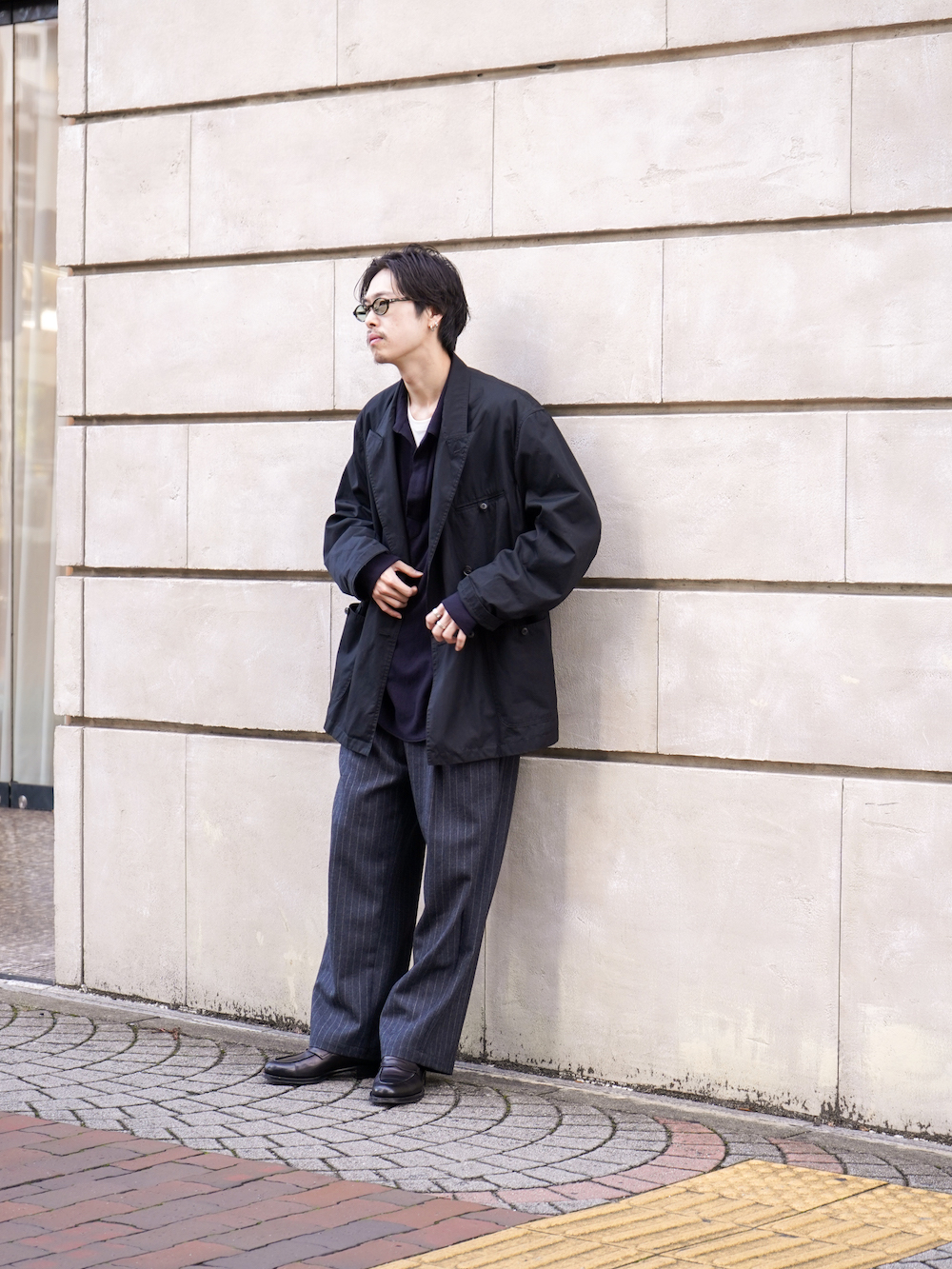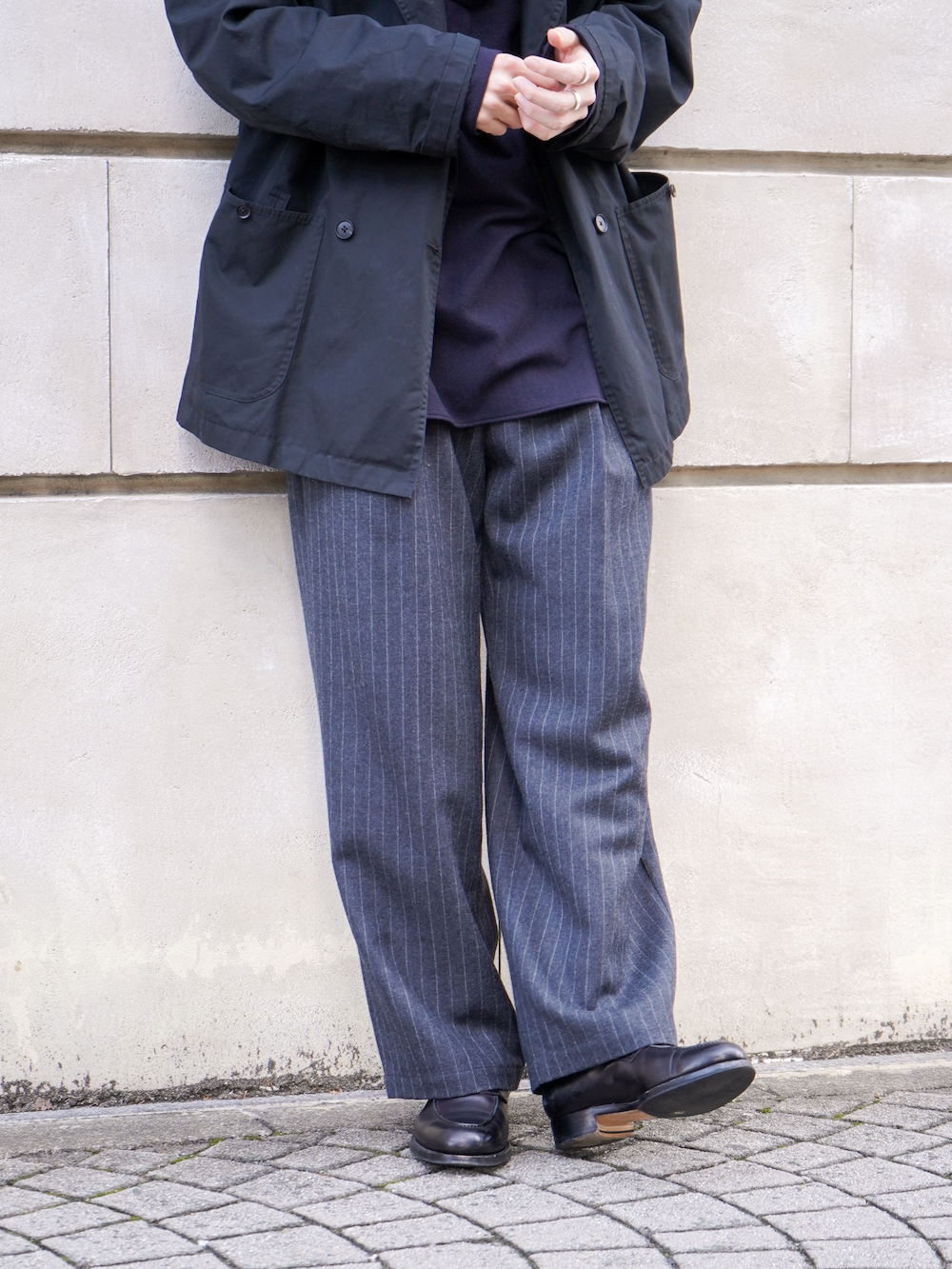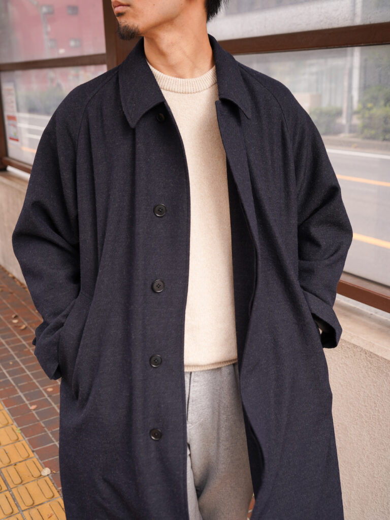 都会的なムードを拾いたかったのであくまで気は抜きつつもコートを選びましたが、面の良い(ウール、カシミヤ)などのブルゾンでウォッシュのかかったデニムパンツなどでも最高ですね。