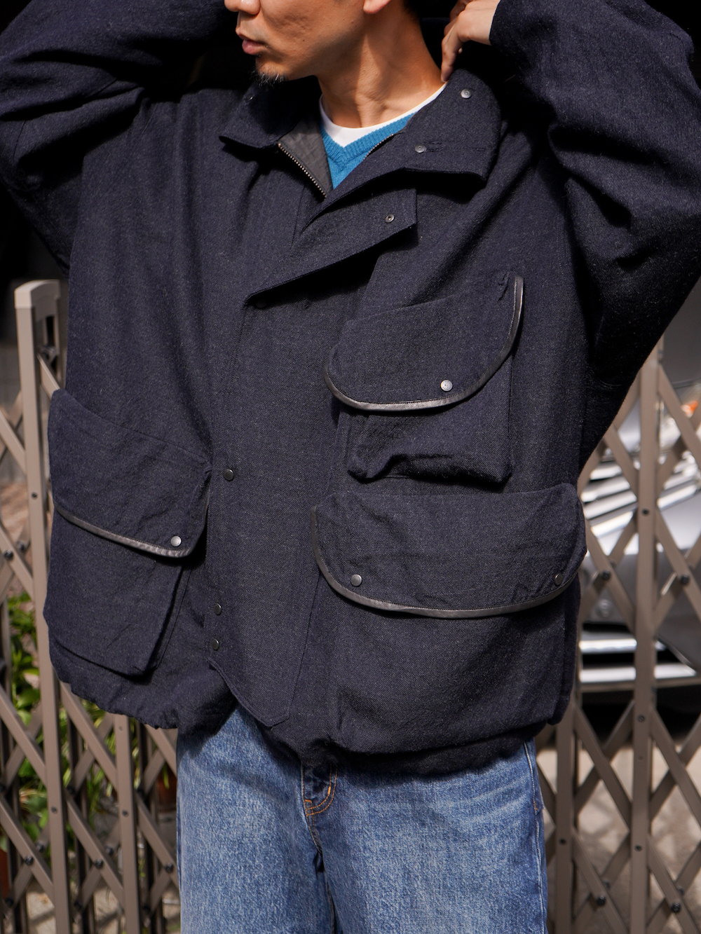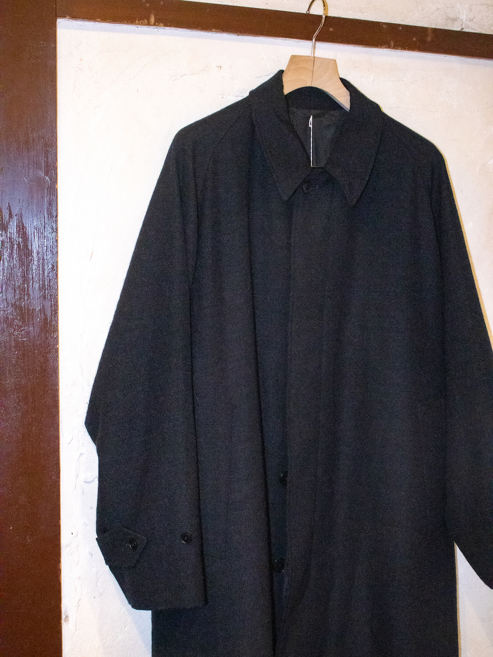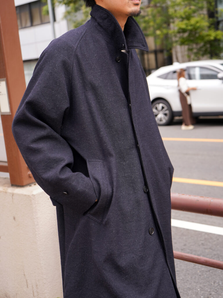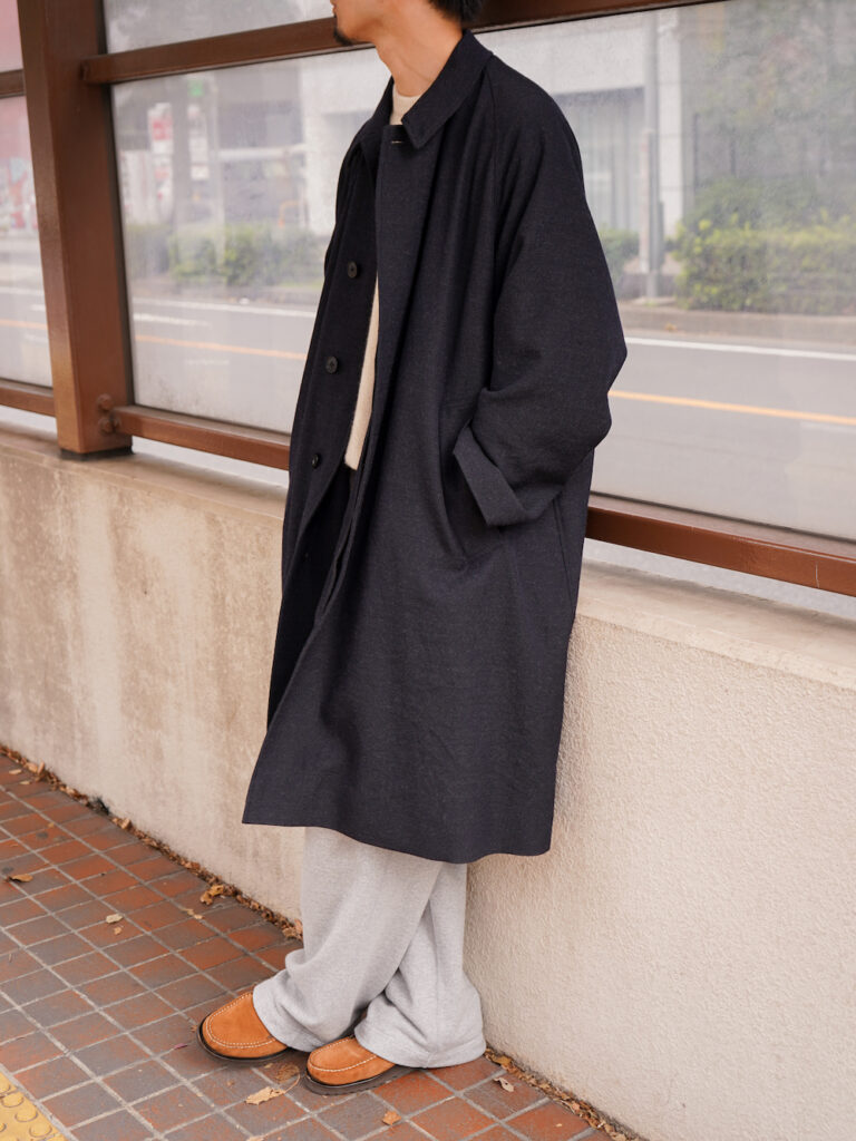 昔ながらのカーコート(古着とか)と比べると、サイズ感はオーバーサイジングでアームのゆとりもしっかり持たせているのでインナーは色々と差し込むことができるのもポイントです。
