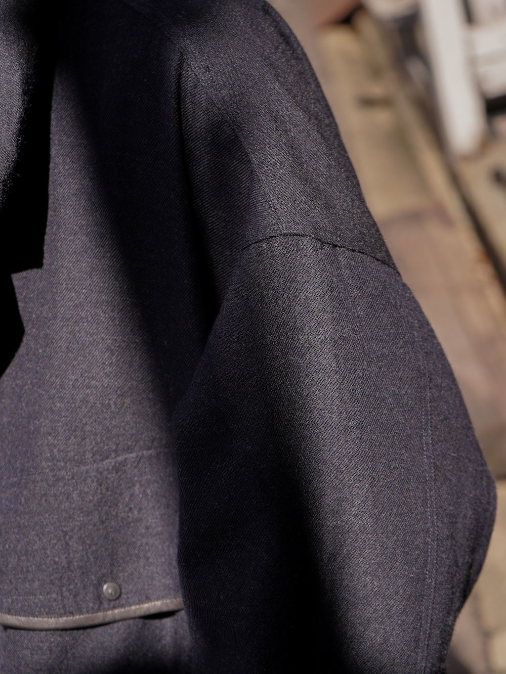 カーコートをベースとしたハーフジャケットで、ゆったりとしたボックスシルエットです。