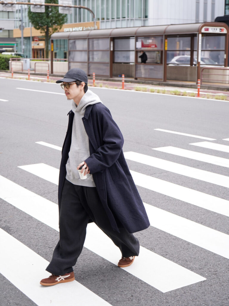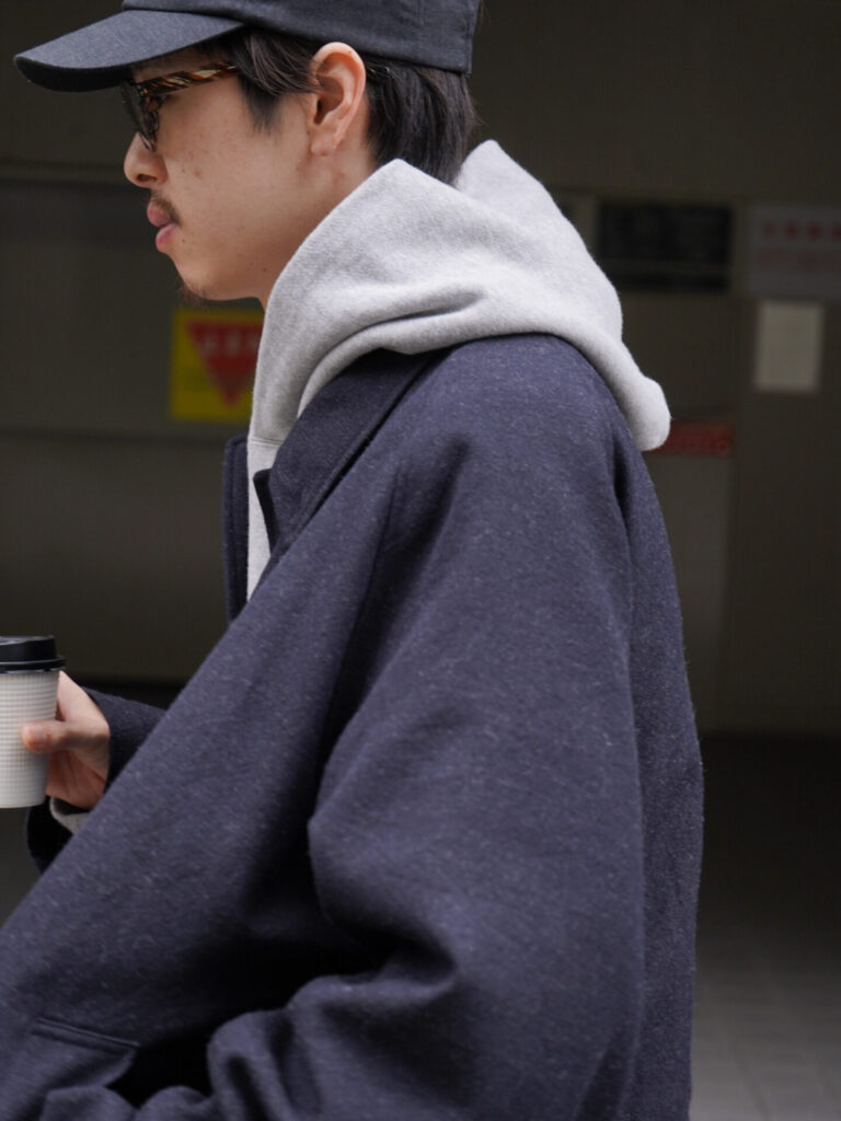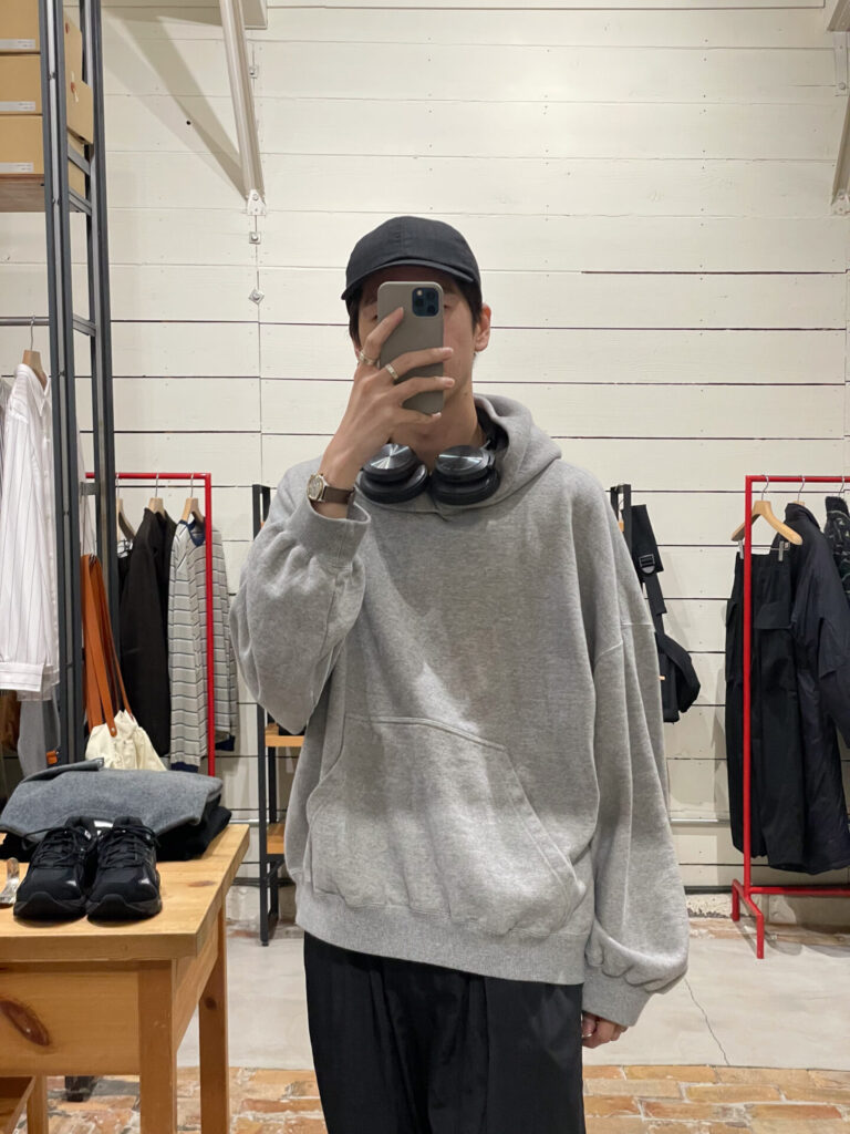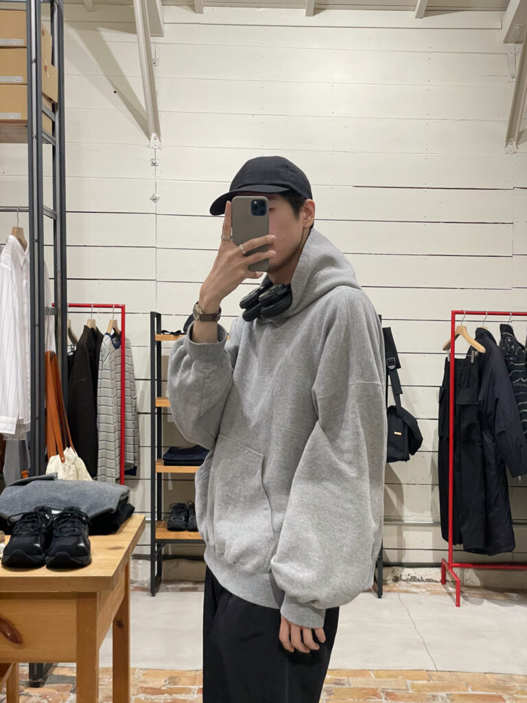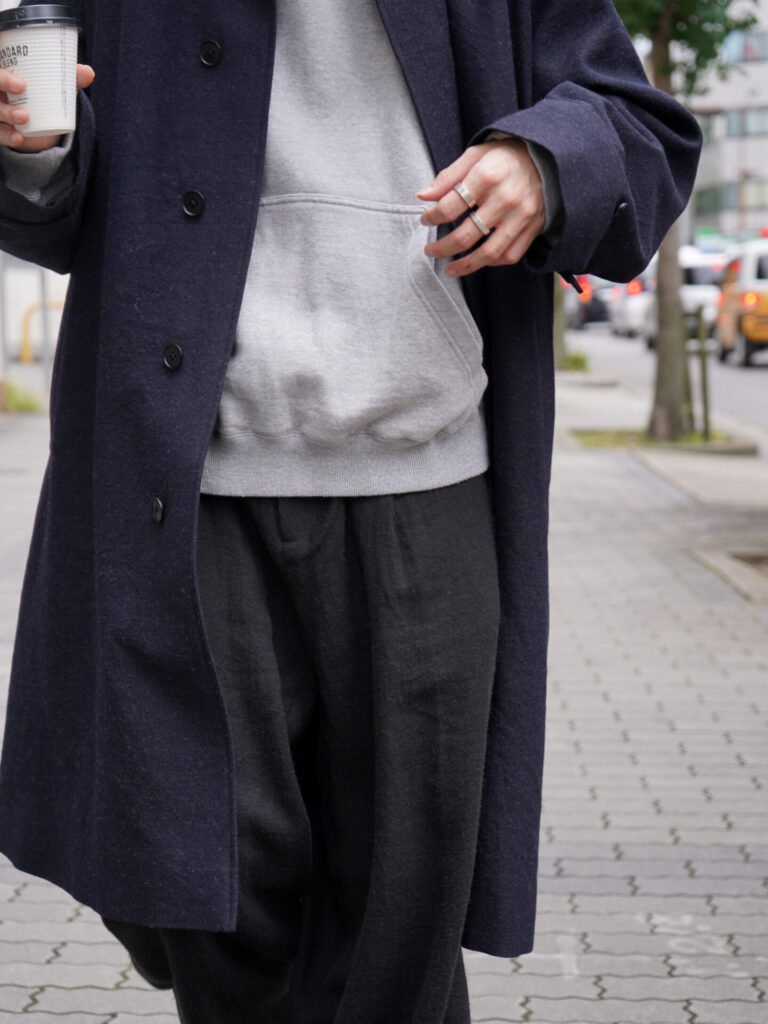 個人的な願望とは別にフーディに手を出したのも理由があって、あわせたいイメージのアウターが豊作だったこともあり、フードがあることによっての首回りのボリュームとアクセントを楽しみたいなと想像していました。しかもこれまたタイミングが良いのか、今までで最もシンプルであり初めての王道杢グレー。ウォッシュ加工による生地の柔らかさをダイレクトに感じながら、ブランドらしいシルエットを楽しむ潔いシンプルさ。