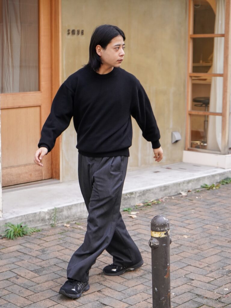 あくまでたくさんある提案の一つですが、カシミヤのニットでウールのギャバスラックス、そしてアシックス。