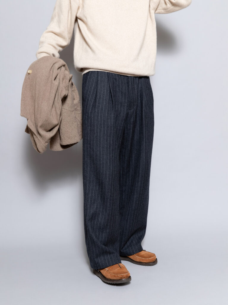ニットなんかもいつもだったらウールだったところがカシミヤであったり、パンツはギャバのトロみや光沢があるものだったり。