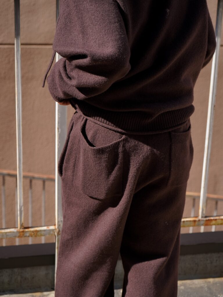 ゲージを上げてとろみや光沢を全面に醸し出すわけではなく、あえて大ぶりな編みでカジュアルさを出すという選択。そこにフェルト化した生地を持ってくる。