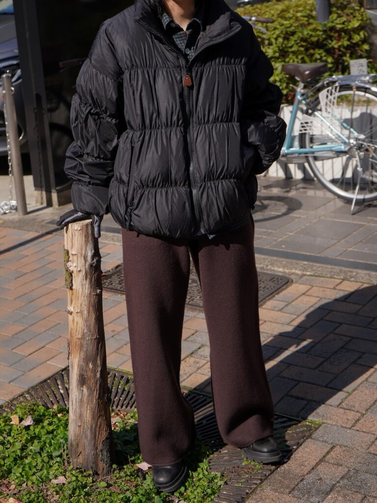 ダウンを軽く羽織っても野暮ったく映らないのも魅力。ダウンを羽織るとそれで完結してしまうからこそパンツはこだわりたいので、適度なルーズさと綺麗な形は必須です。洒落た街着として、はたまた寒さを凌ぐ防寒着として、ファッションを楽しめると思います。