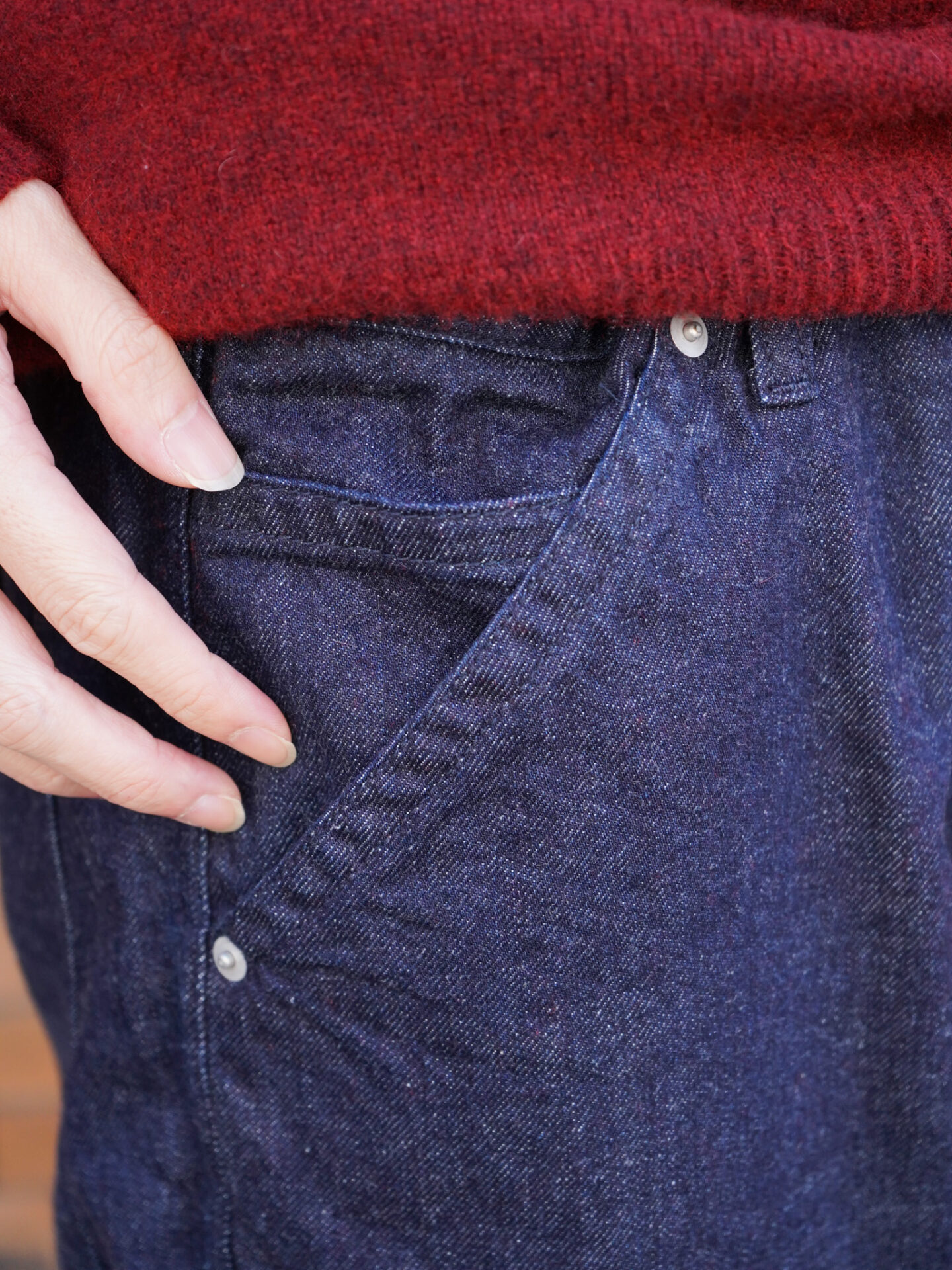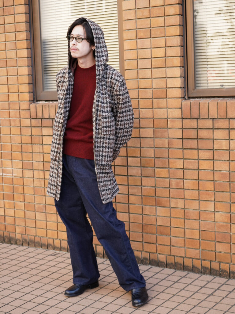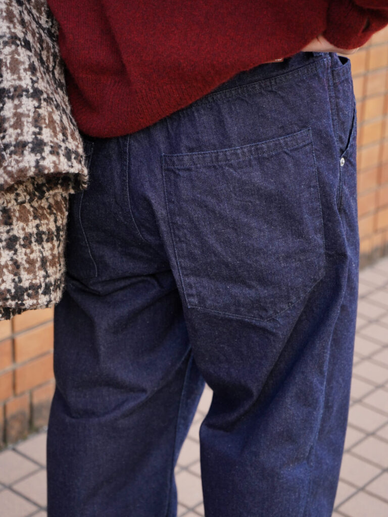 いろんなブランドでデニムをセレクトする中で、明確に違いを持って選んでいるのですが、ENCOMINGはその形と生地感にあります。英国的なムードを日本人目線でという特殊な体系のブランドだからこそ狙っていくデニムもアメリカ的ではなくヨーロッパ的な解釈が加えられています。それは先ほどの形やデザインによるところからも理解できますし、何よりデニム生地の産まれも関わってきます。