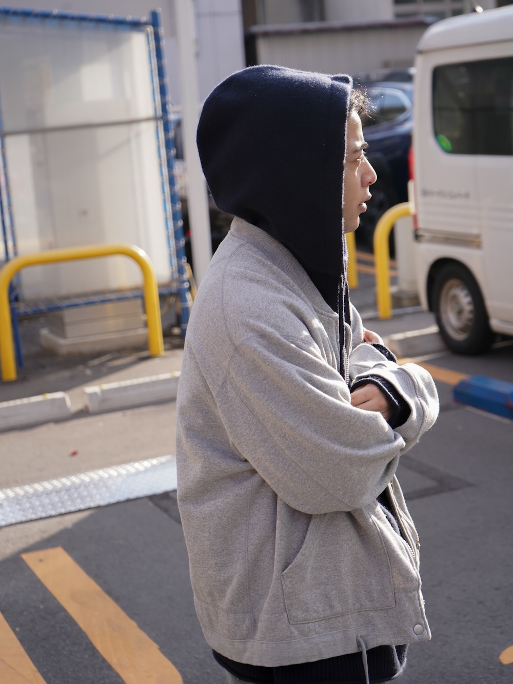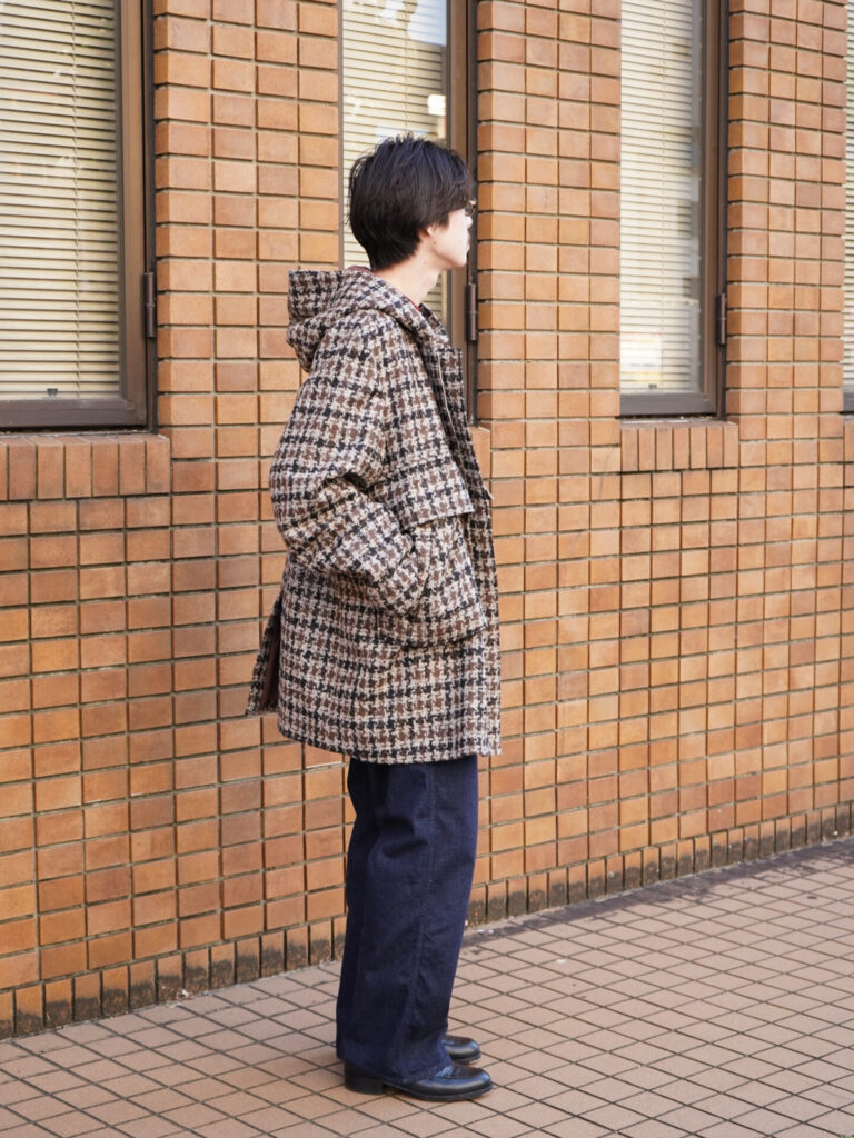 着丈のバランスも独特で、後身頃の丈が短くなっており、ポケットに手を入れた際に横から見たらシルエットがぐっと前に下がった印象を強調しています。