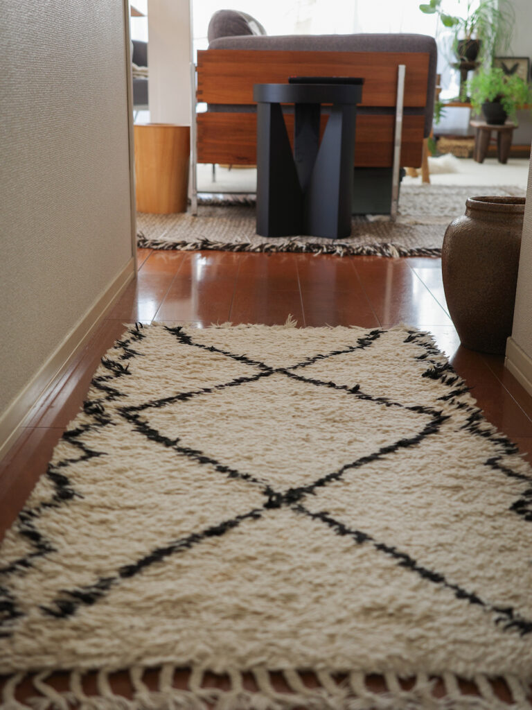 我が家はベニワレンとザナフィを愛用していますが、私がモロッコラグの好きなポイントとしては、色んなテイストに馴染んでくれるシンプルさがとても気に入っています。