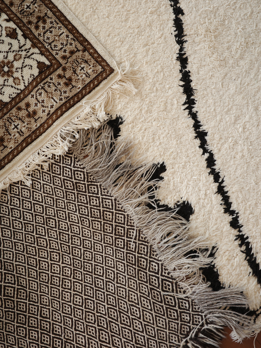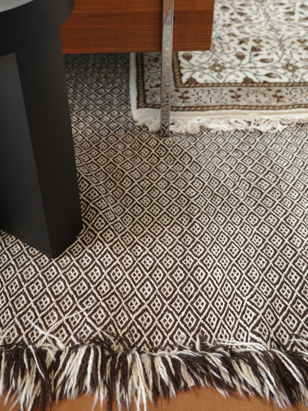 モロッコラグ以外にもトルコ絨毯や中東のギャッベなどの異なるテイストのものをいくつか持っていますが、私の経験上、中東系のものだったりアフリカ系のものだったりはエスニックなムードが強かったり、柄の主張が激しかったり、シンプルを好む部屋のコーディネートには少々使いづらいなと思うこともありますが、一方でモロッコラグの親和性の高さには驚きました。