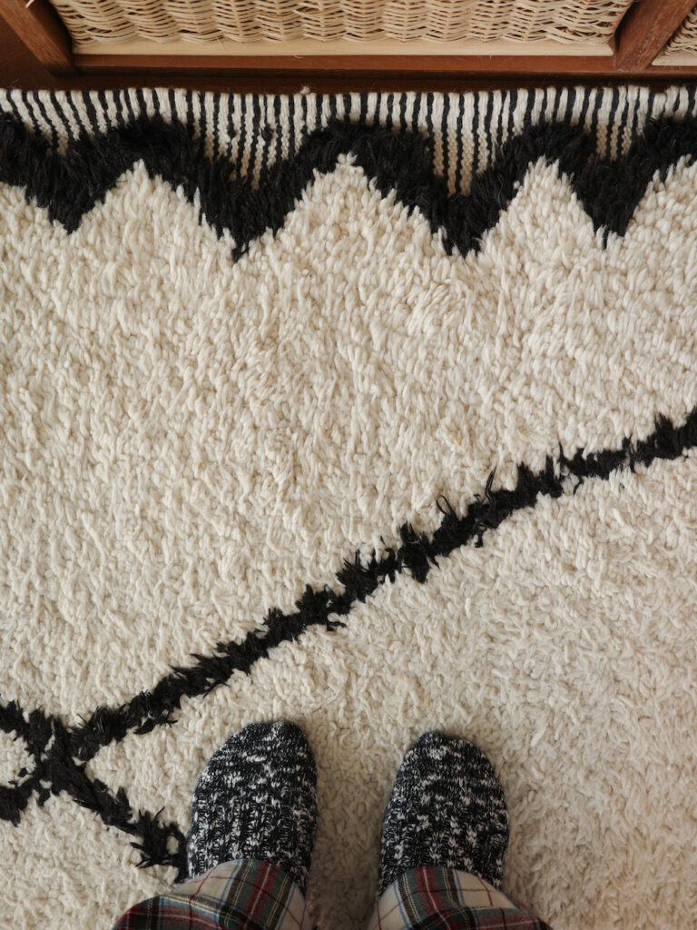 厚手でふわふわと柔らかな毛足の長さが特徴で、天然ウールで作られたモロッコラグは調湿作用がある為冬以外の時期も快適に使用でき、我が家では季節限らず一年中お世話になっています。