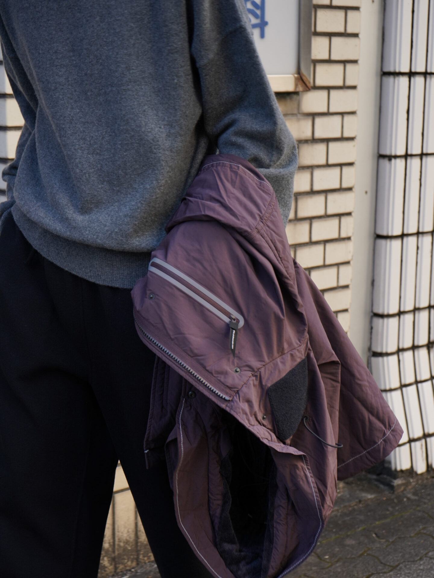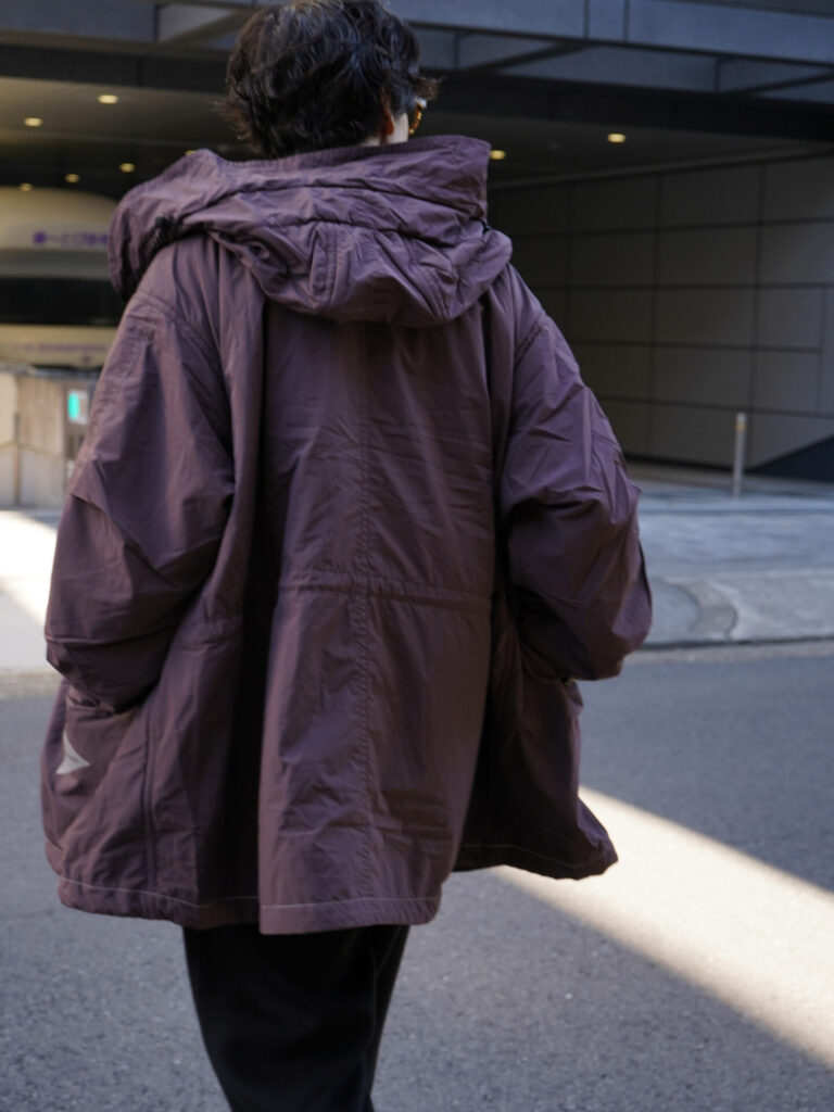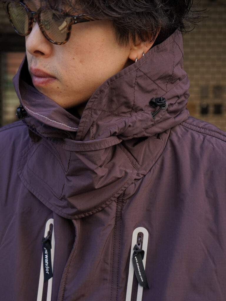 ナイロンのリップストップ組織なのですが、生地全体の風合いが製品染をしたかのようなフェード感とドライな表情を持っており、所謂アウトドアの素材に連想されるツルっとパリッとしたイメージとは異なる感触にファッション的なスタイリングの広がりを感じたのです。
