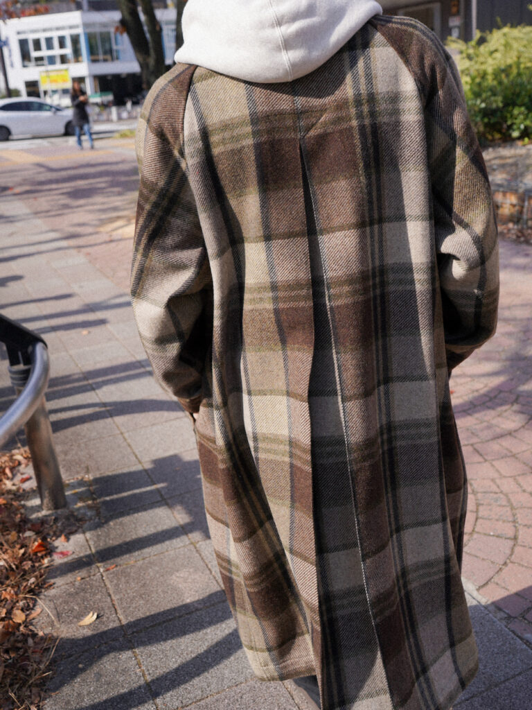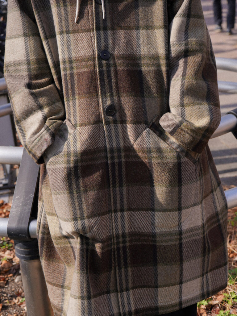 日が暮れるのも早い冬の寒空。スッと息を吸い込むだけで肺が縮こまるような冷えた空気すらも、暖かくほのぼのとした雰囲気で全身を包み込んでくれるダイナミックなチェック柄のバルカラーコート。