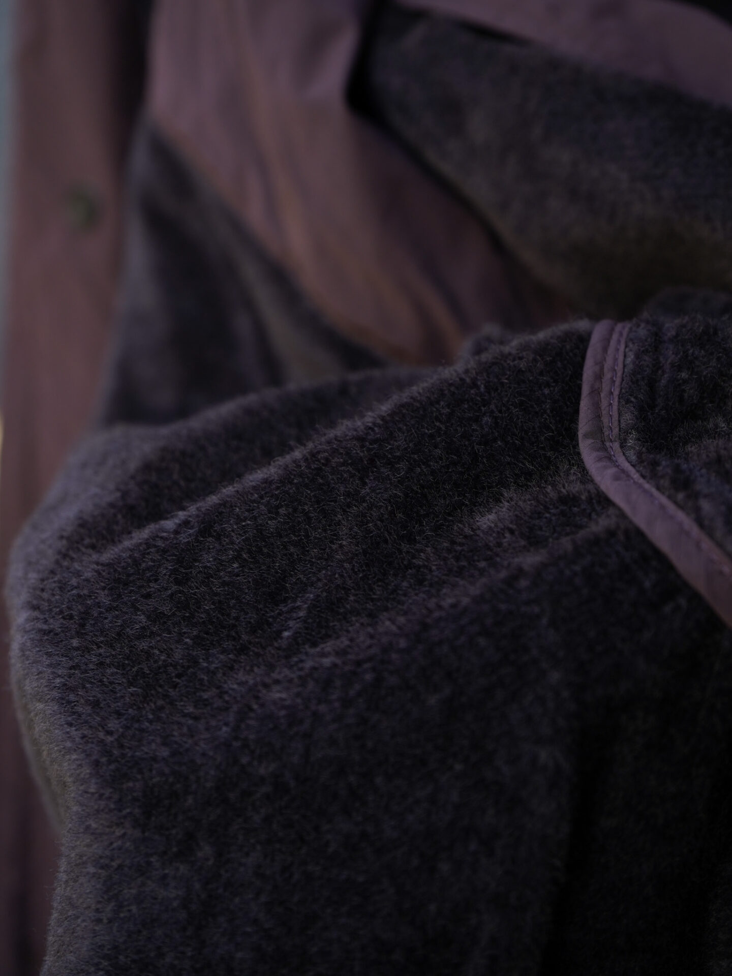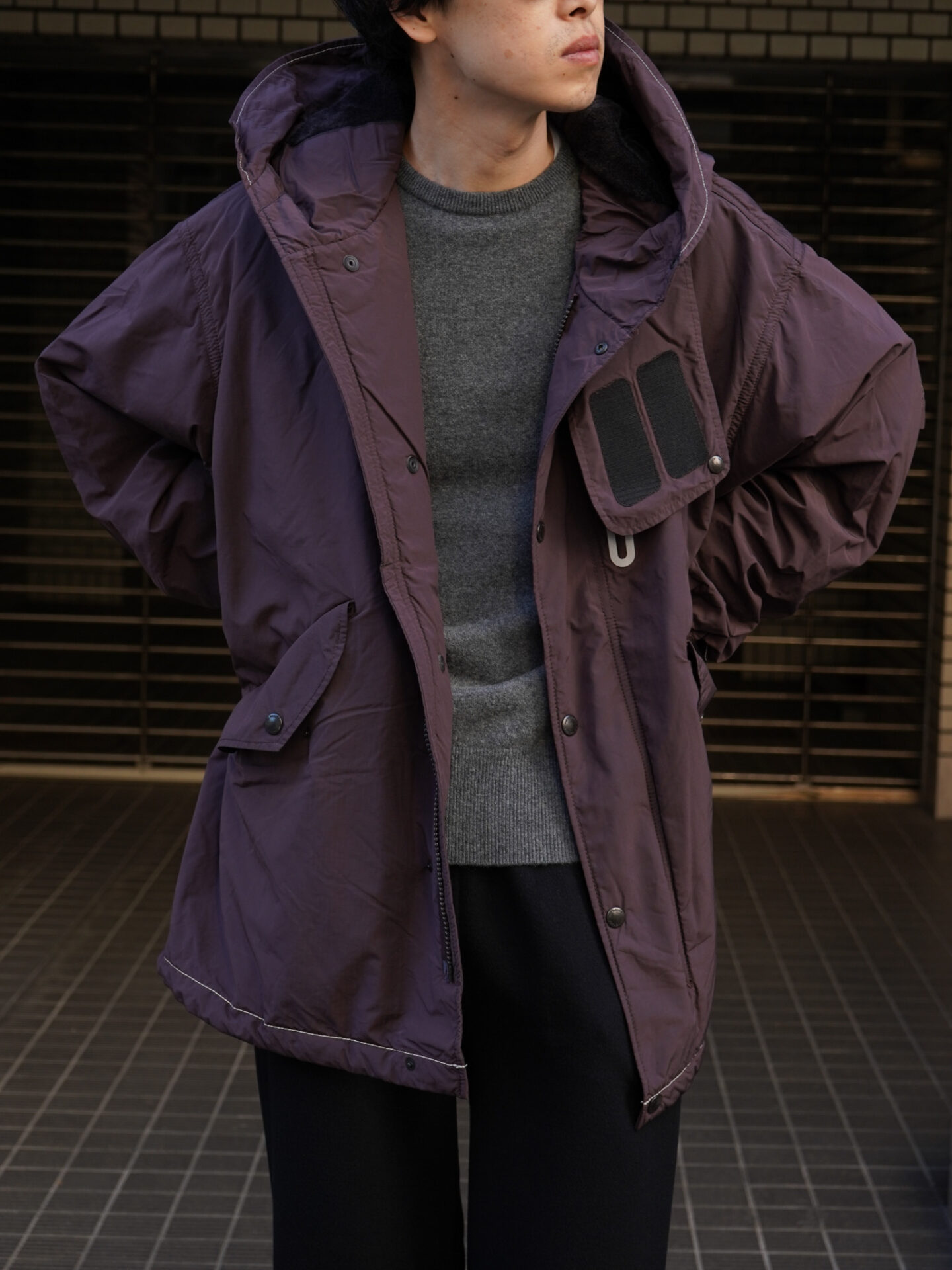 今期のand wanderは落ち葉、紅葉をテーマにしておりカラーパレットもそんな紅葉を連想させる編成になっています。このコートもベーシックなブラックに加えて、そんな落ち葉を思い浮かべるバーガンディブラウンとの2色で提案。ミリタリーコートだからの王道色ではなく、ブランドの世界観の中での表現を徹底しているからこそここにしかないムードについつい手が伸びてしまうのだと思います。