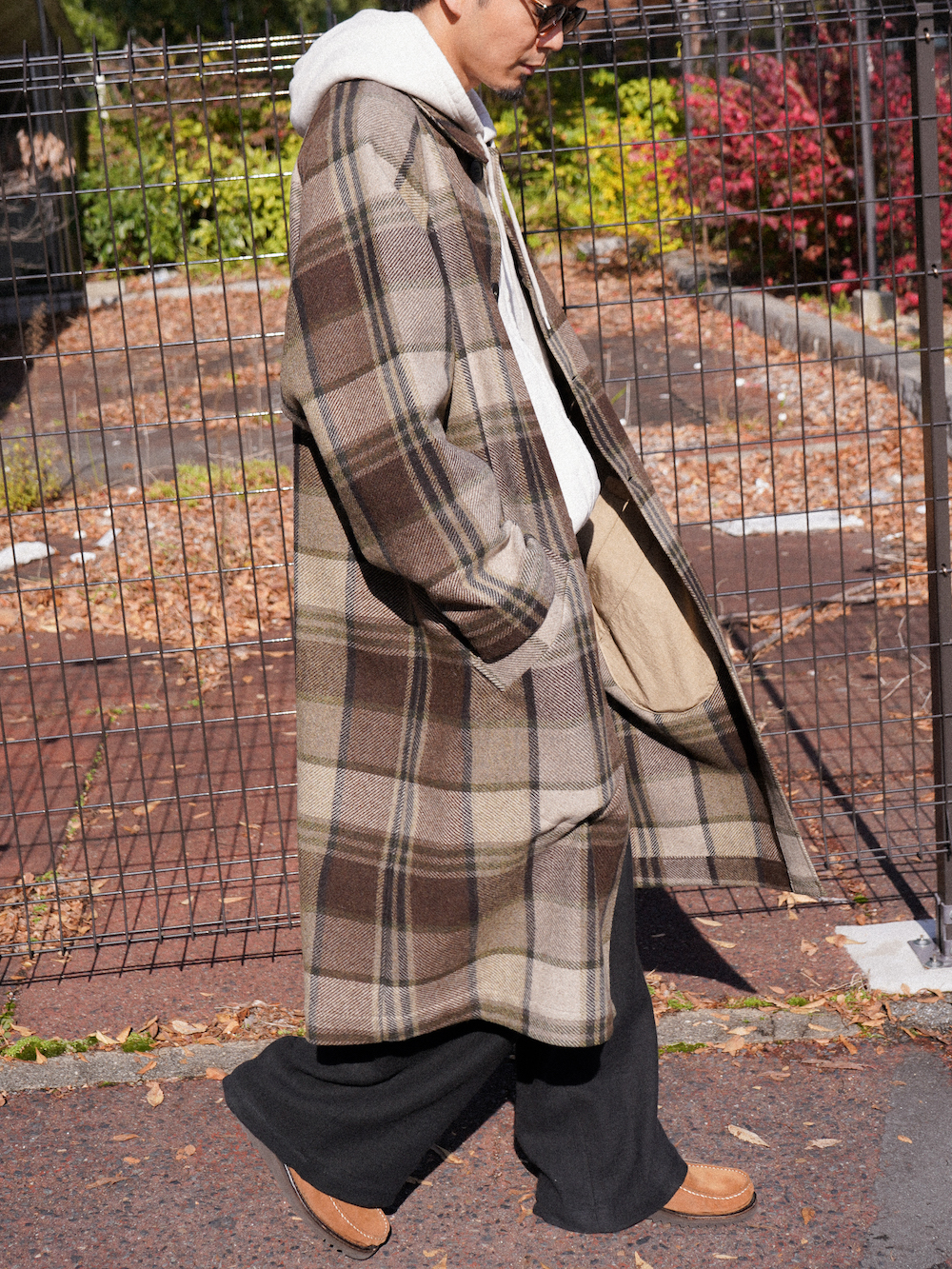 ゆったりとした袖付けのおかげでスウェットでもシャツでもニットでも。何でもばっちこいな気軽さがコートの堅苦しさを取っ払ってくれる。昔から袖が細く、身幅もシャープな物作りが多いブランドですが、どこに行くにも適当にばさっと羽織ればそれでOKな器の広さに惹かれました。