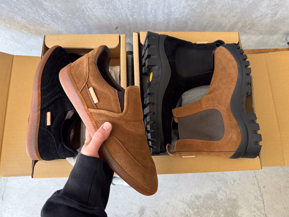 そこでこの2型。side goreはビブラムソールながらも全体的にスッキリとしたバランスで、Derridaは言わずもがなガムソールのベタベタのスニーカータイプで幅が狭く見える見た目です。