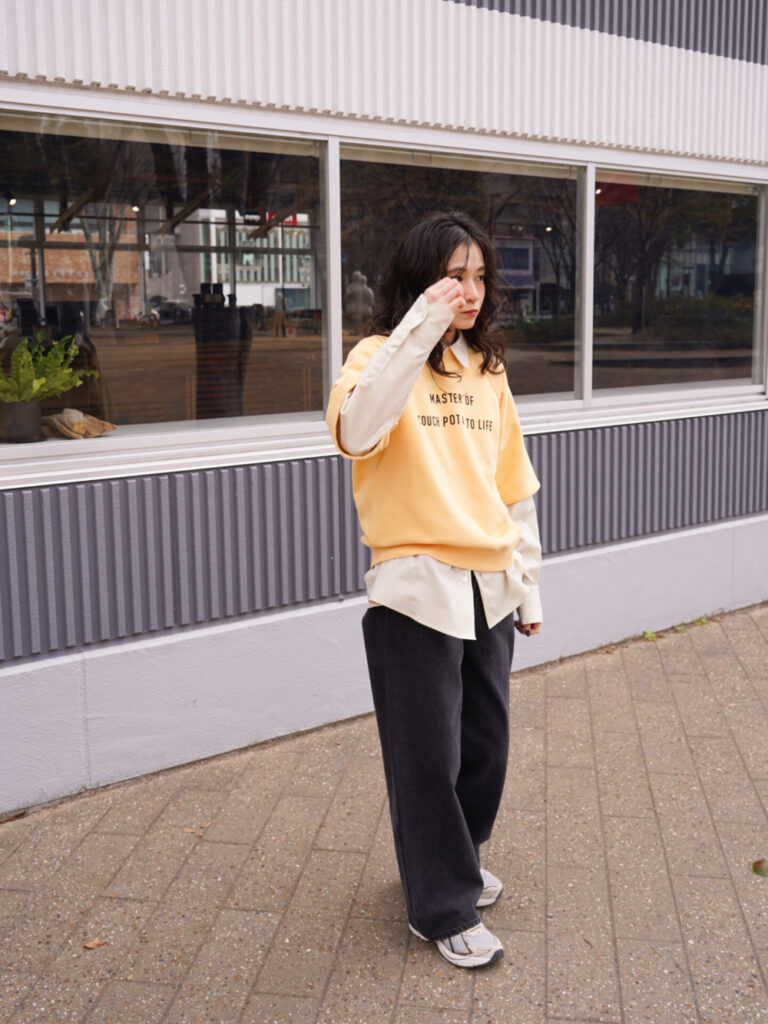 この様に薄手のシャツとレイヤードしても着膨れする事なく綺麗なシルエットで、かつ女性の体格を考えたオーバーサイズ感で小慣れた印象にしてくれます。ロンTやタイトめのカットソーと合わせても可愛いです。